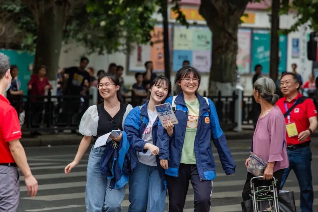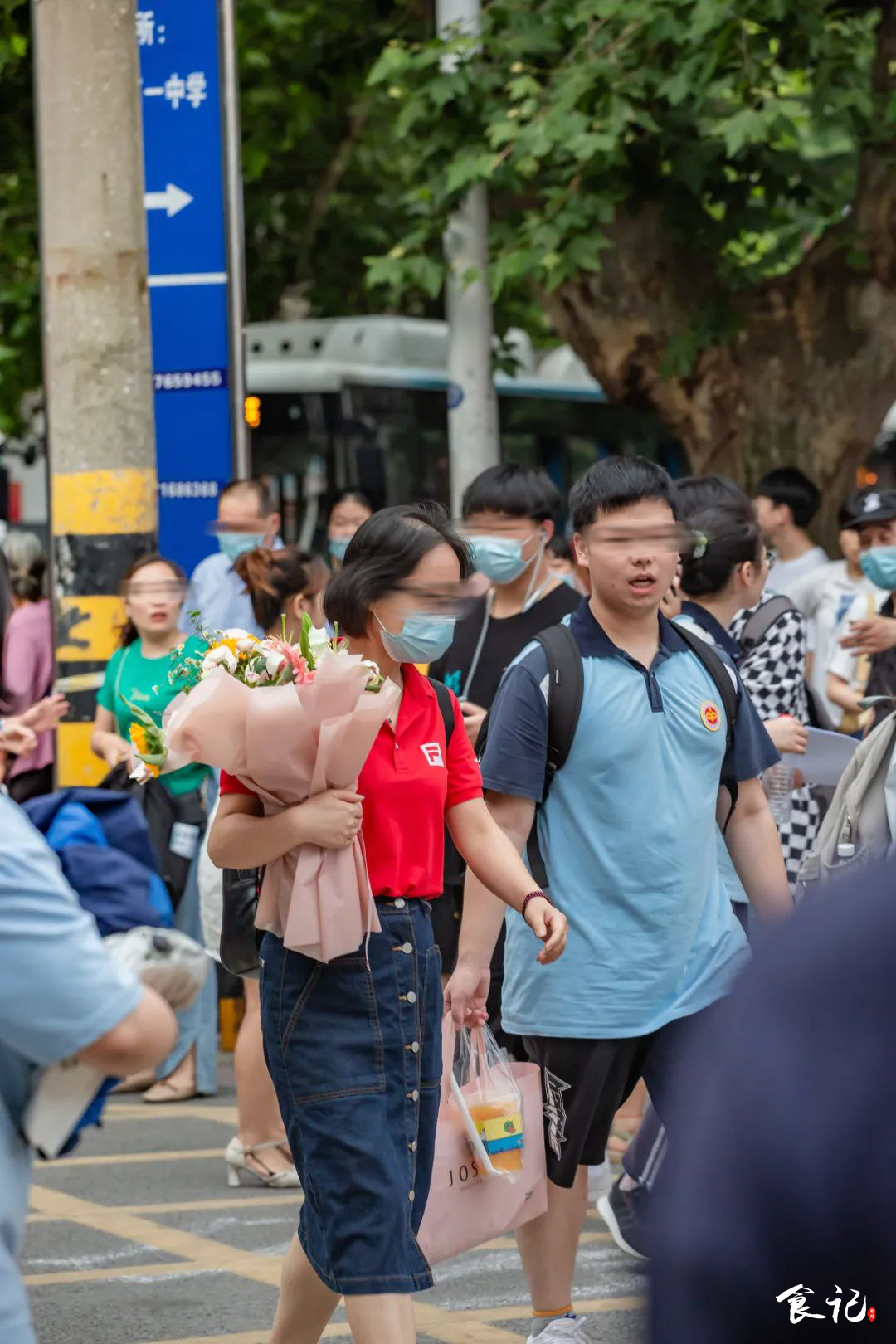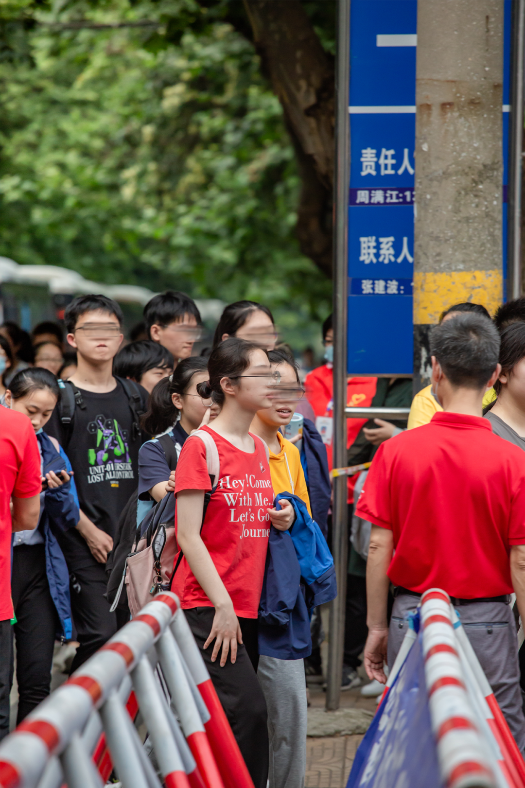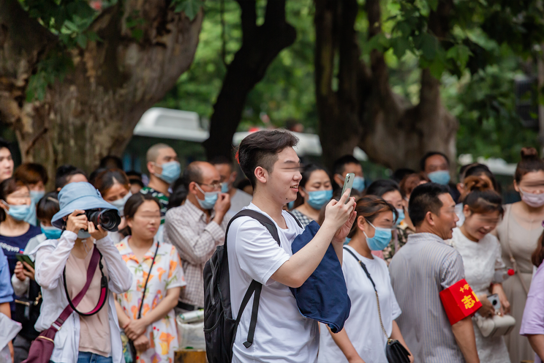 考生逐一走出考场,无数手臂高高扬起,“小宇!”“这边儿!”——家长们的目光在相似的身影中急切搜寻,妈妈挽起孩子,带出拥挤的人群。