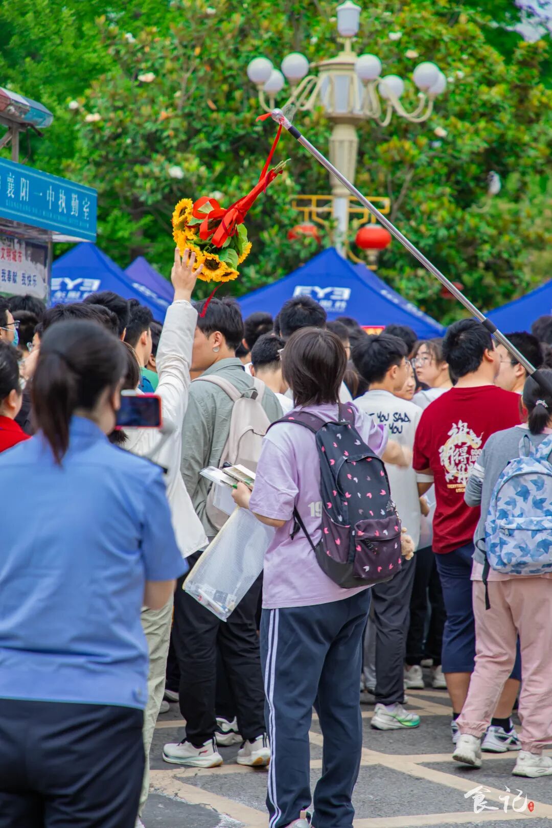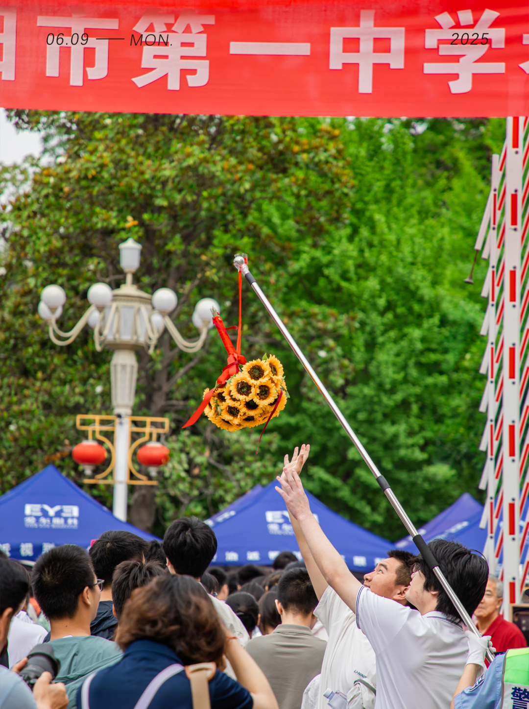 一中校门外,已经记不太清是从哪一年兴起的传统,许多学生会在进场前奋力跃起,触摸考场门口悬挂的向日葵,跳起的那一下,紧张被短暂冲散。——“夺魁”,勇夺桂冠!