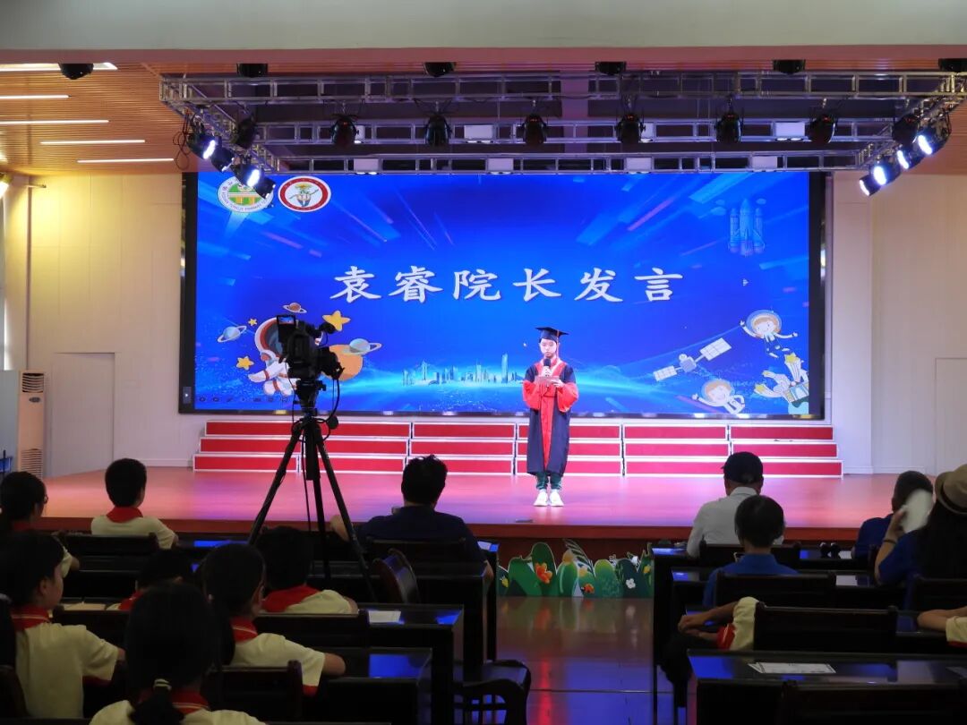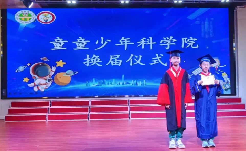在童童少年科学院换届仪式上,袁睿院长为新一届院长 —— 五 8 班张靖研颁发证书,标志着科技探索的接力棒正式传递。