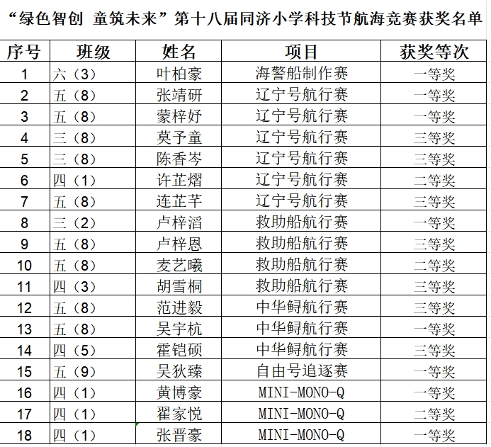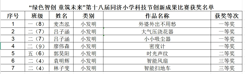 在科技节各项目中,积极参与和成绩显著的班级,评为创新研究所:一(8)甜甜研究所、一(11)睿梦飞驰研究所、二(5)梦海研究所、二(6)小红研究所、二(9)追梦研究所、三(8)星星之火研究所、四(1)小蜜蜂研究所、四(2)彩虹桥研究所、四(4)童真研究所、四(8)花儿研究所、四(9)茉莉研究所、四(10)红红火火研究所、五(7)飞翔研究所、六(4)小博士研究所、六(5)茉莉研究所、六(7)卓越研究所