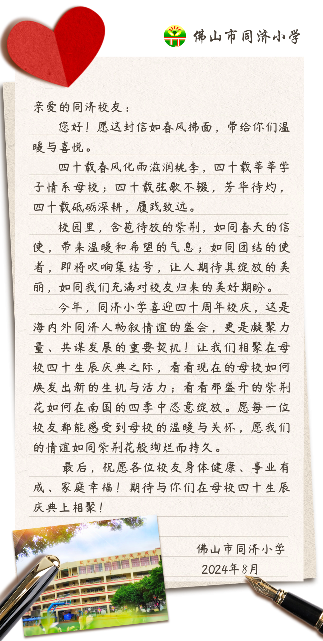 昔日你以同济为荣,今朝同济以你为傲。在同济小学四十周岁生日即将到来之际,为加强同济小学与校友之间的联系,搭建校友沟通的桥梁,共谋同济小学的发展大业,佛山市同济小学拟成立学校校友会。欢迎关心支持“同济小学校友会”建设发展的校友加入!相信在师生和校友的共同努力下,同济的明天更加辉煌!