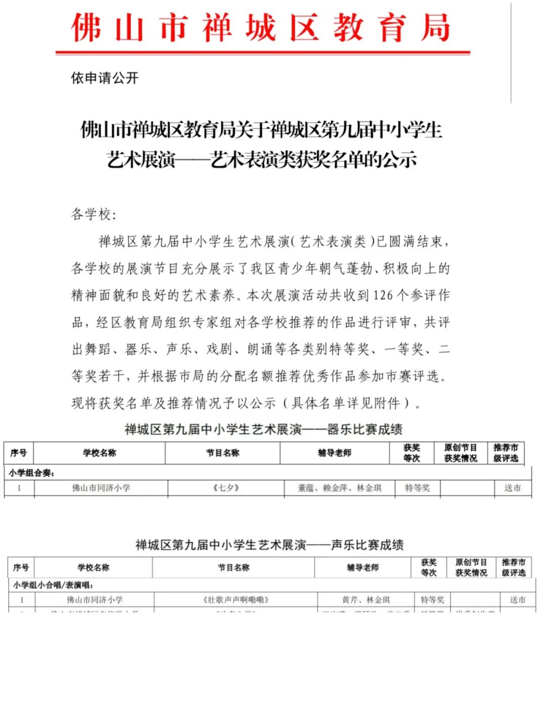 我校“乐乐”管乐团和“童心”小歌手社团在禅城区第八届中小学生艺术展演活动中分别荣获小学器乐合奏类及小学表演唱类特等奖第一名!两支优秀的展演队伍将代表禅城区参加市赛!