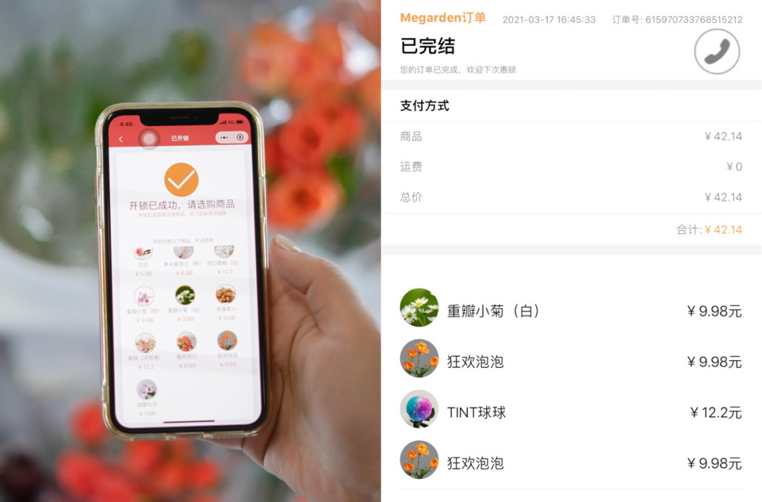 机器完全全自动,扫码开门,自选鲜花,关门后小程序自动识别拿取了多少鲜花,有清晰的列表查看核对,非常方便快捷!