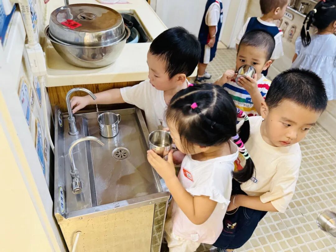 老师说:“喝水时候要抓紧杯子的耳朵才不会洒哦。”