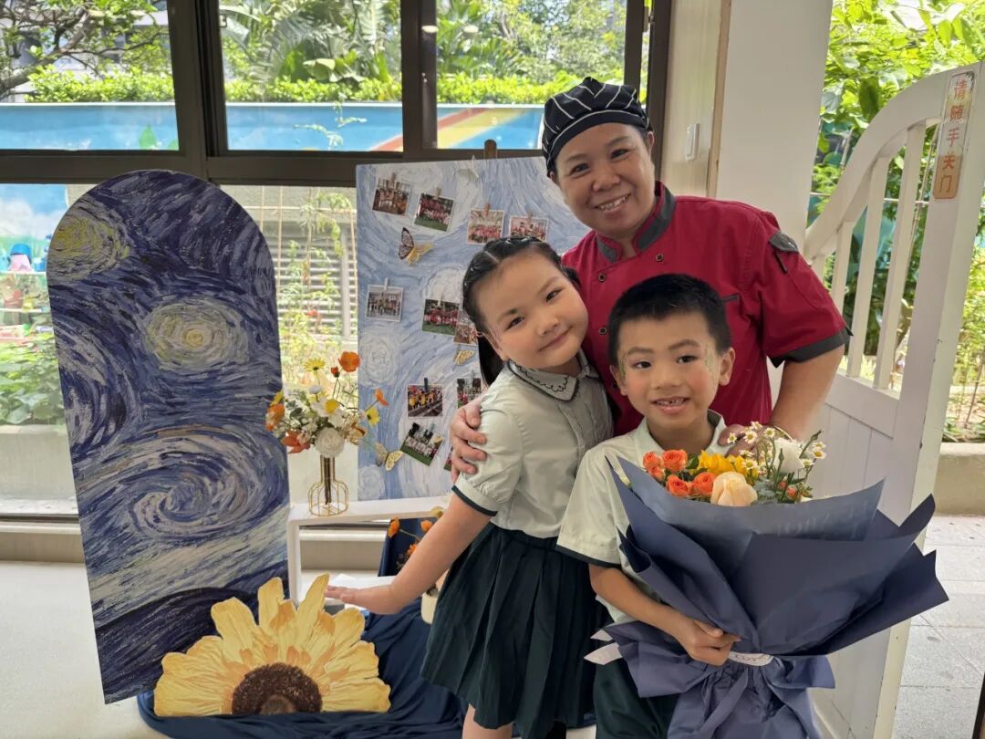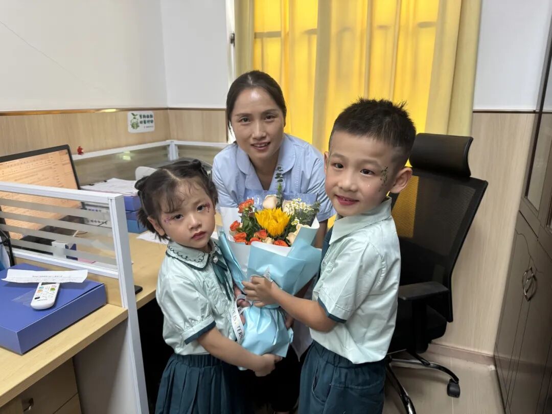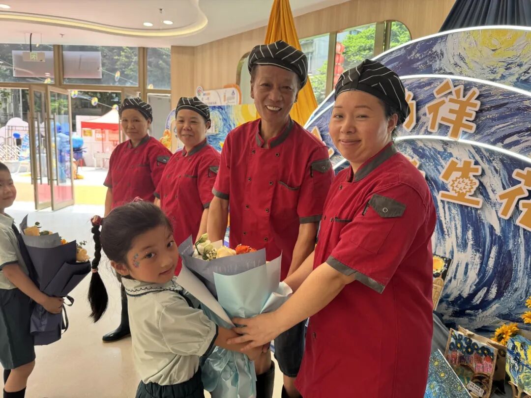 孩子们也给医生阿姨、食堂叔叔阿姨和门卫叔叔们献上了鲜花。