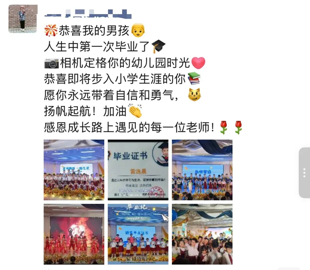 毕业典礼落下帷幕,温暖与感动仍在蔓延。家长们纷纷在朋友圈、微信传递心声,用文字诉说对幼儿园、老师的谢意,那些质朴话语,是满心认可,也是这场毕业礼最美的 “回响” 。
