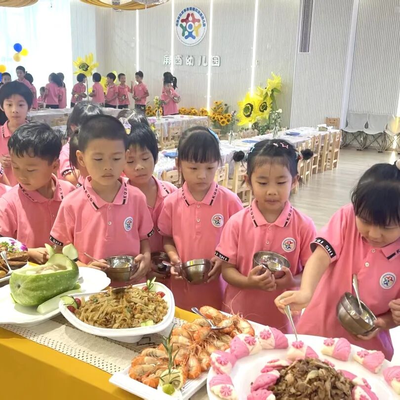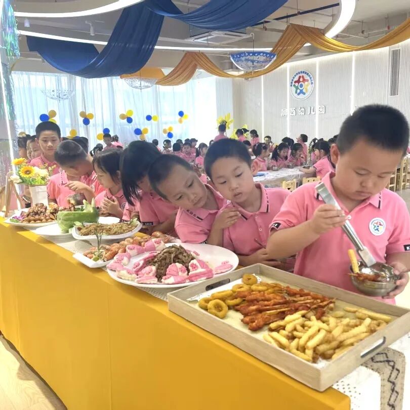 我们排着整齐的队伍,端着餐盘挑选美食。