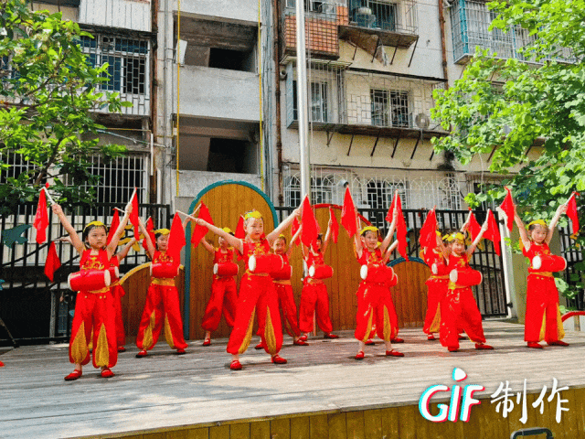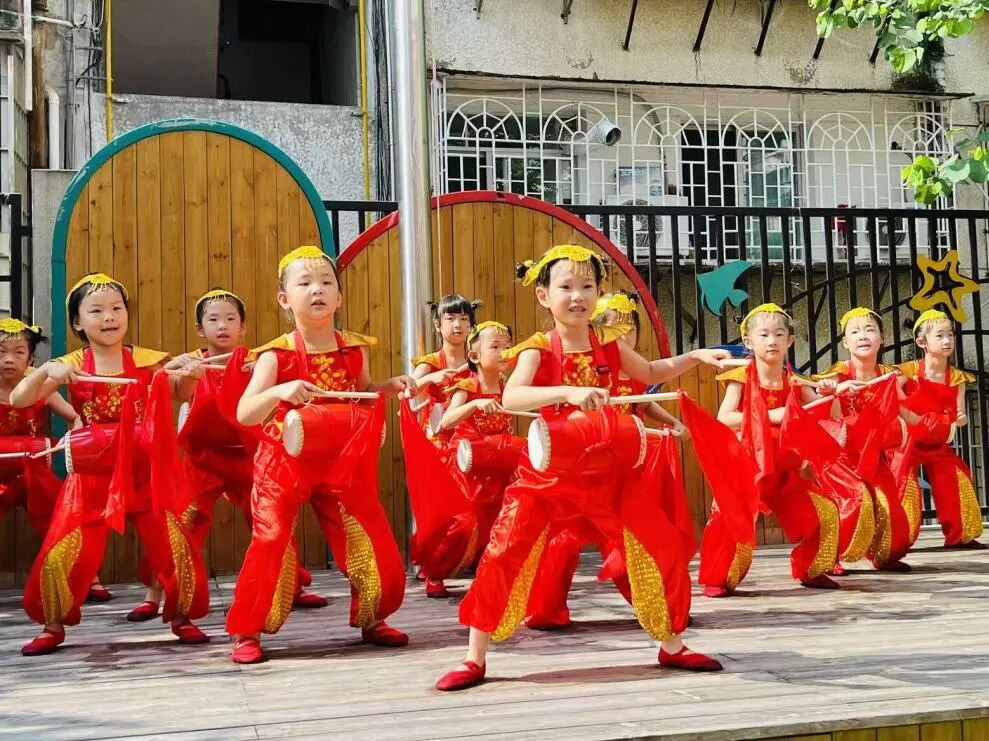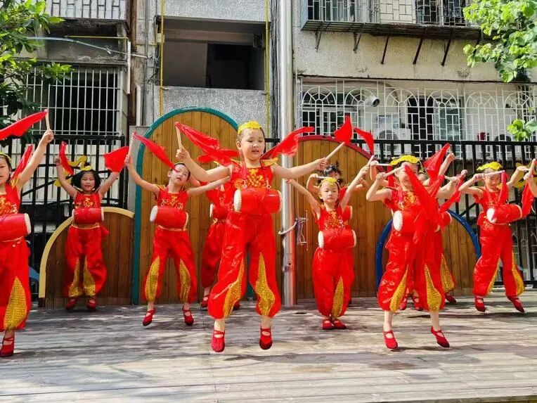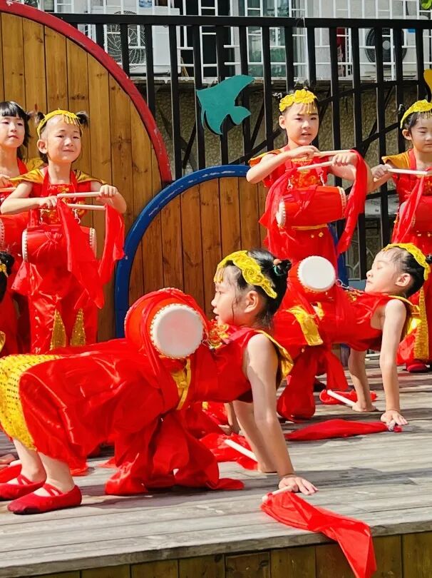 瞧!身系红绸腰鼓的孩子们擂响铿锵,飞扬的鼓槌与跃动的步伐流淌着喜悦的节奏。