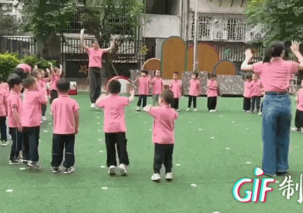 看!中班的弟弟妹妹跟着老师认真的进行运动前的热身动作。