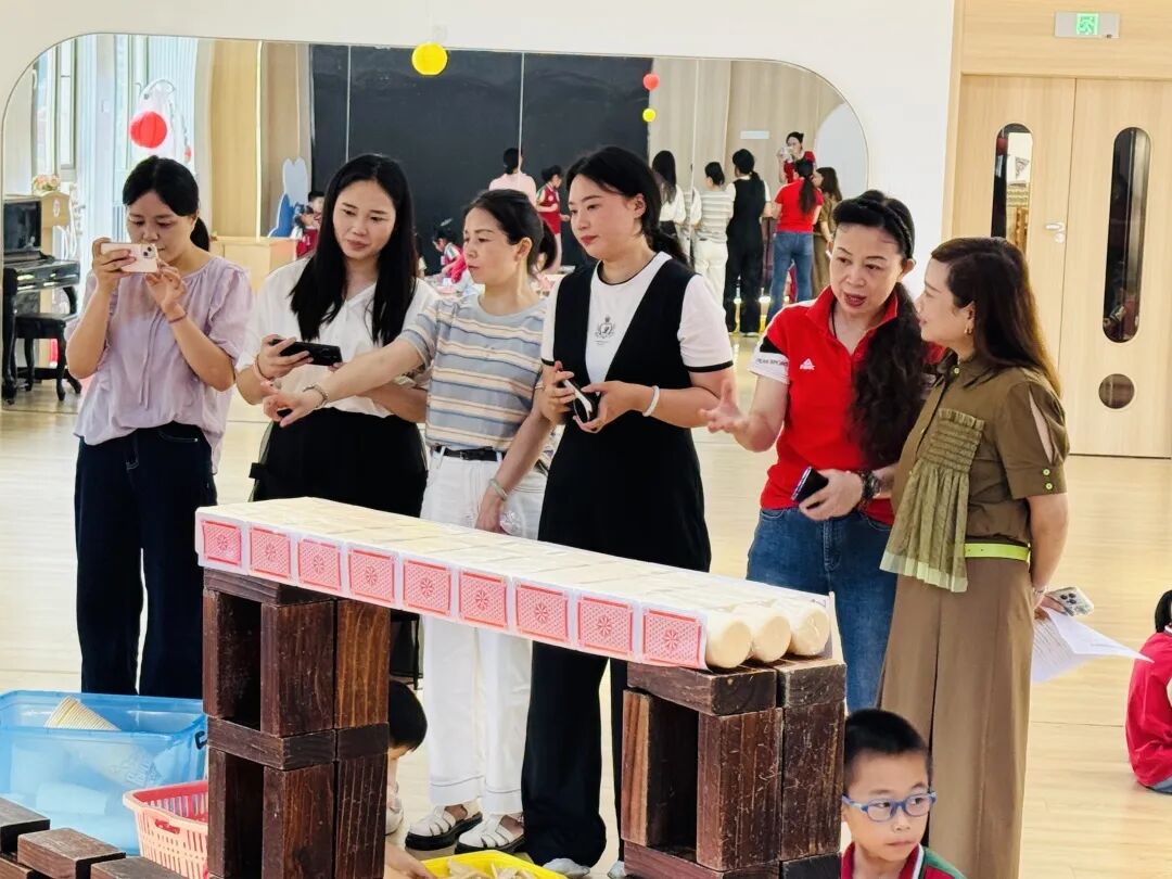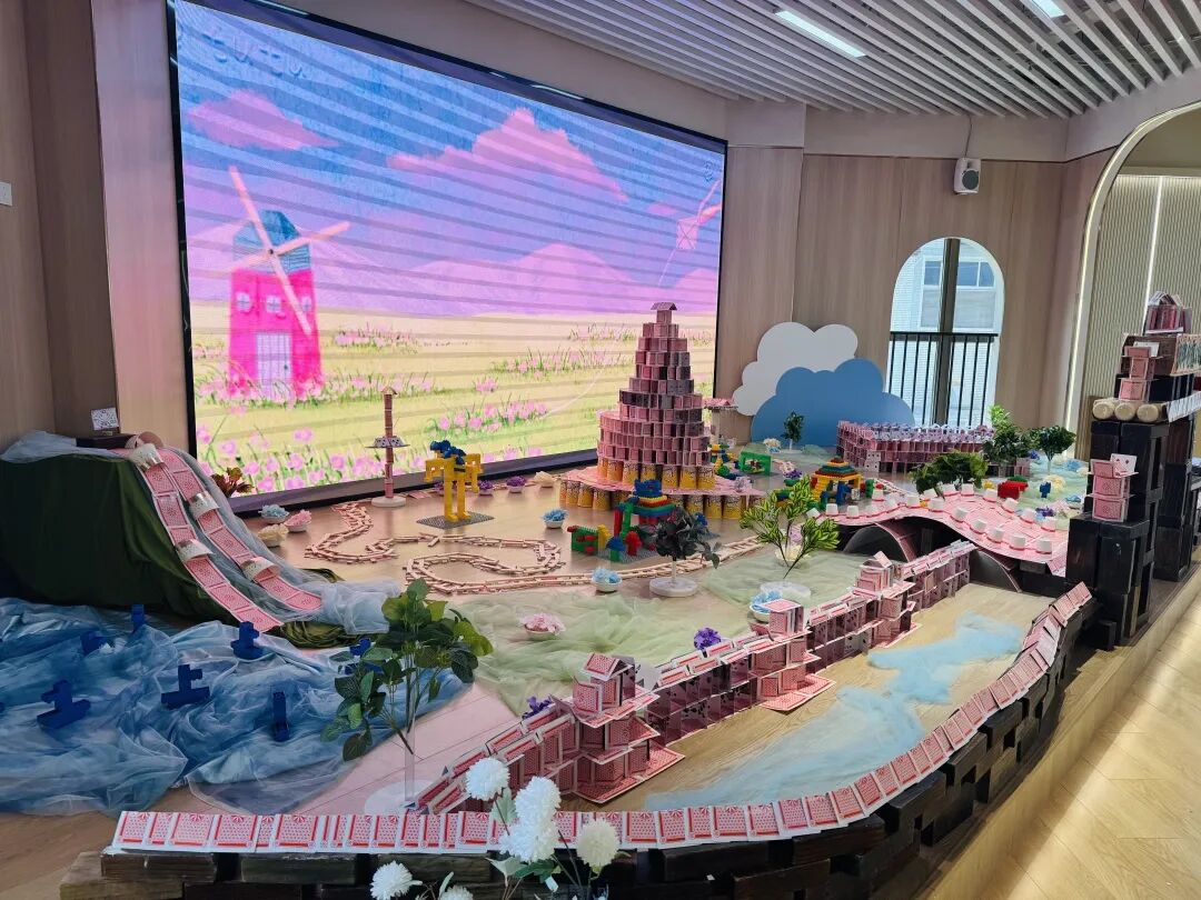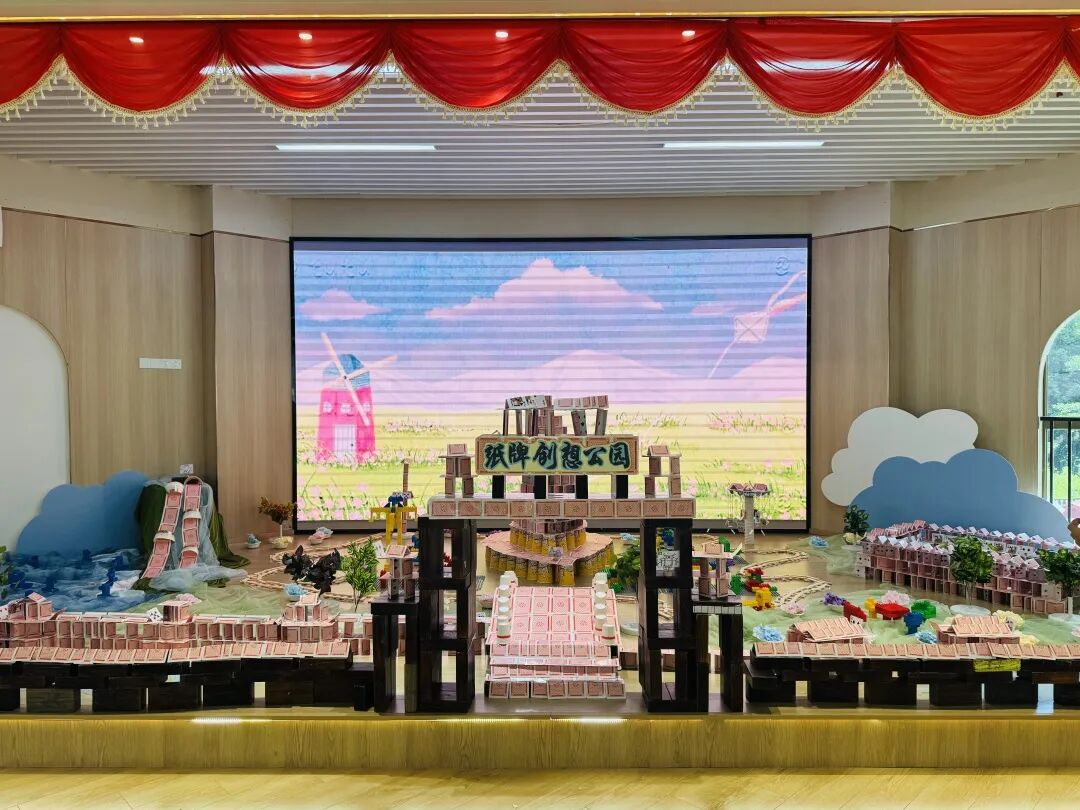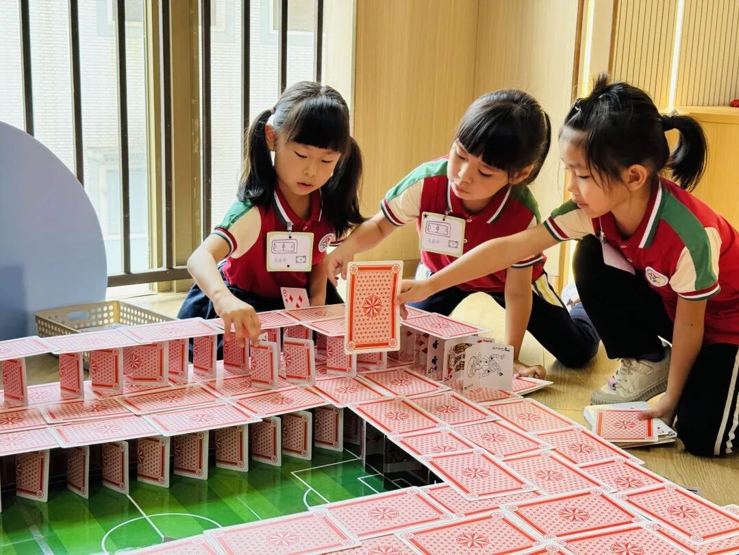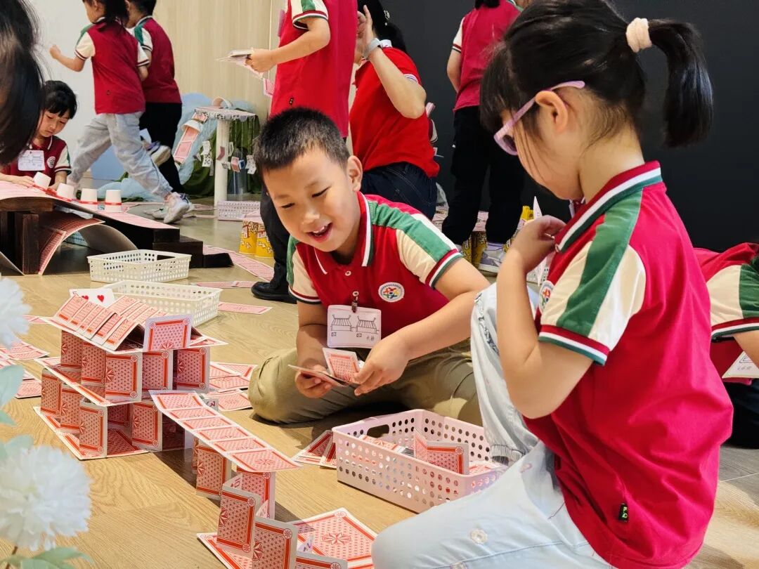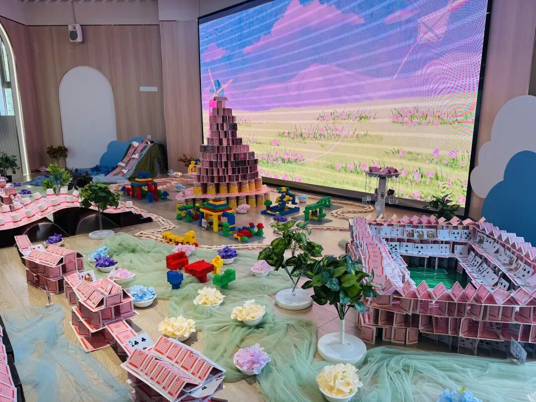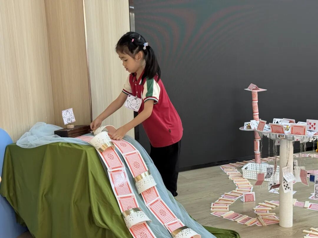 孩子们运用低结构材料创意搭建的纸牌公园,其巧思与完成度令观摩的老师们赞叹不已。