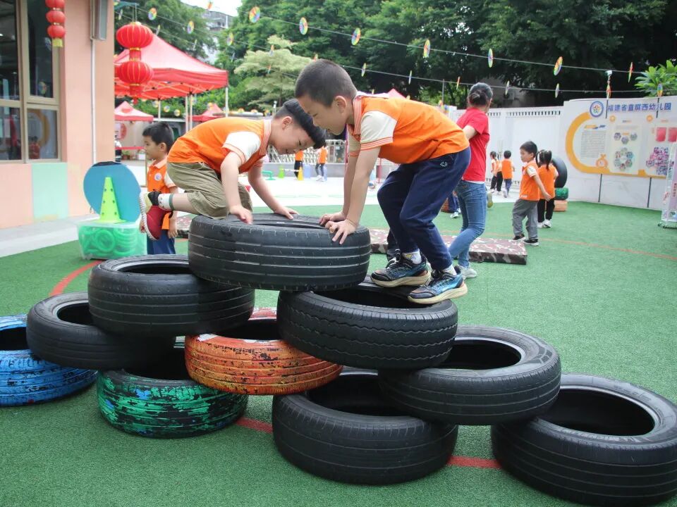中班的孩子们在老师的带领下,巧妙利用轮胎、水桶、梯子等生活化的材料,呈现了趣味性且多样化的晨间运动。