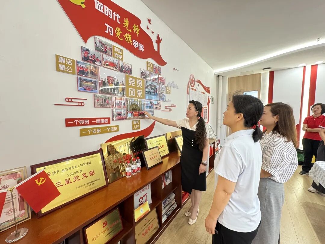 天福幼教同仁通过实地观摩党建文化墙展示,系统查阅党支部标准化建设材料,进一步深化了对党建工作的理解认知。