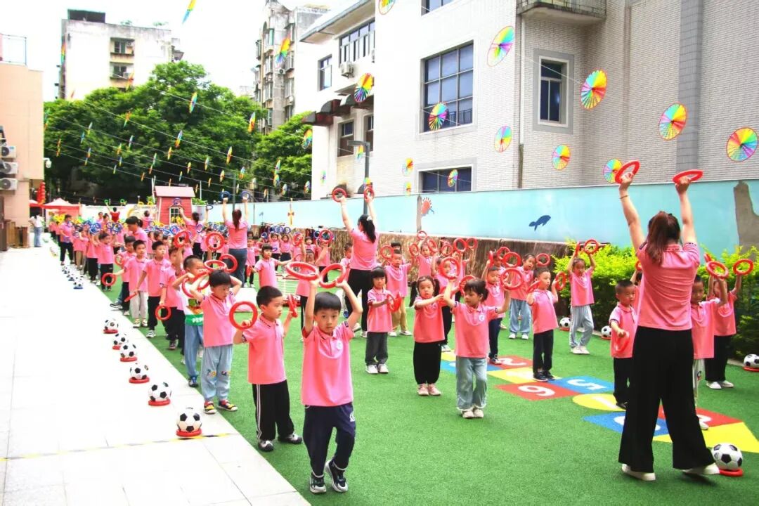 中班小朋友巧妙运用器械,伴随着音乐节奏灵活变换队形,用灵动的身姿与默契的配合,展示自己的风采。