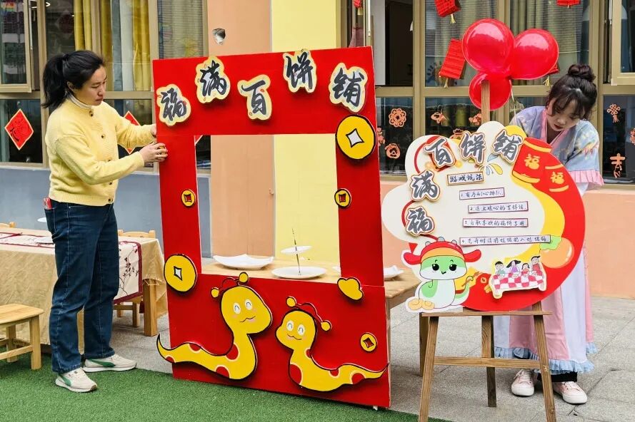为了给孩子们更好的游玩体验,老师们集思广益,化身魔术师,将五彩纷呈的庙会展现出来。