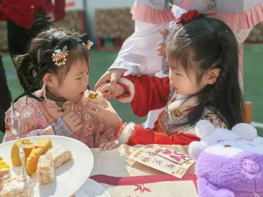 桃花酥、如意糕、礼饼、元宝饼、茯苓糕、马蹄糕......各式各样的福饼堆成小山,孩子们用特制的游园票兑换甜蜜。
