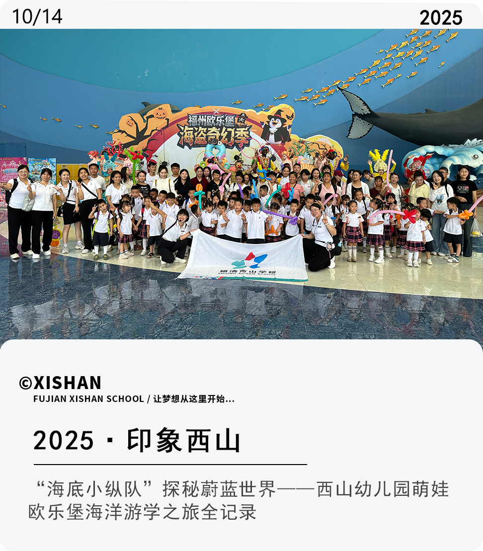 10月14日,西山学校幼儿园迎来了一场别开生面的秋季游学活动。孩子们满怀憧憬地化身“海底小纵队”,在老师的悉心带领下,踏入福州欧乐堡海洋世界的大门,开启了一段融合知识、趣味与探索的奇妙旅程,让童真的欢笑与蔚蓝的海洋碰撞出绚丽的火花。