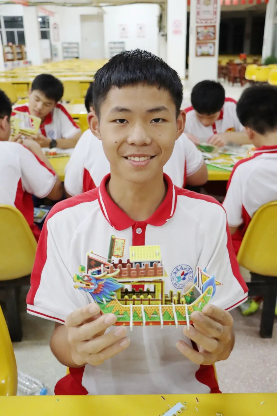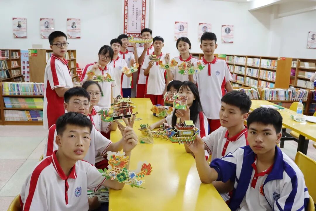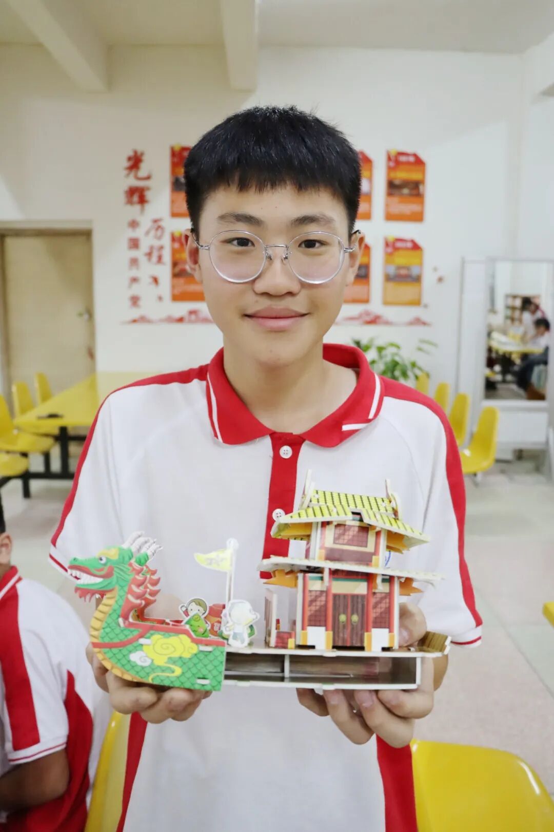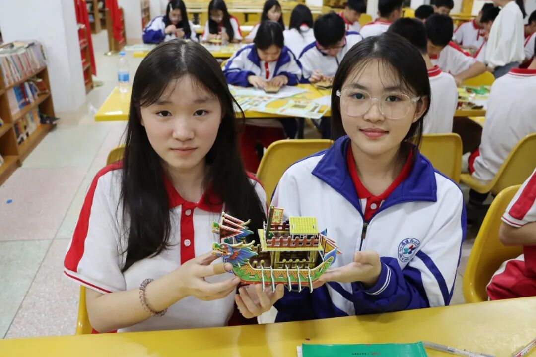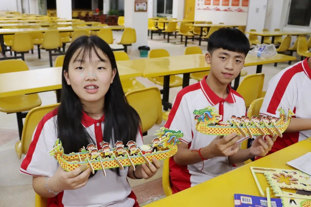 拼龙舟环节,现场一片忙碌。部分同学对照图纸拼接龙舟拼图,卡扣咬合间,立体骨架成型;另一部分同学则组装粘贴船身,用贴纸装饰龙头龙尾。大家互帮互助,传递材料、交流创意。随着最后一片船桨安装完成,形态各异的龙舟模型摆满桌面。欢声笑语中,同学们既体验了手工乐趣,也触摸到端午习俗的文化温度。