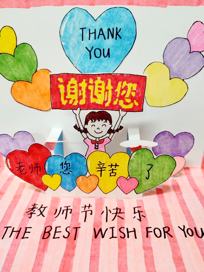 为了感谢老师们的谆谆教导和辛勤付出,同学们特地亲手DIY了漂亮的手工贺卡,将满满的爱意与祝福,送给每一位老师,祝老师们节日快乐!