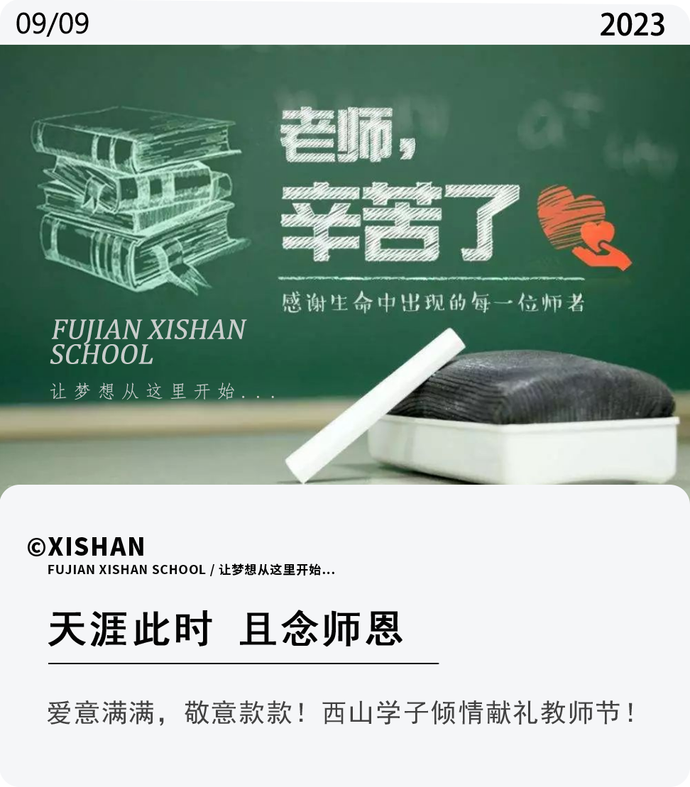 @初一8班周子涛同学:青春让我们在跌跌撞撞中成长,而老师的点播和指引也成为我前行时不可或缺的力量。老师这个名词,是学识的象征,来到西山之后,却也总让我觉得有除了课堂以外的亲近。我不曾想过未来会怎样,但我想我一定会记得西山老师们给予我的鼓励和支持,以及学习、生活上的关心与叮嘱。在这个有温度的日子里,我想把最最真挚的祝福送达,祝愿老师身体健康,工作顺利!教师节快乐!