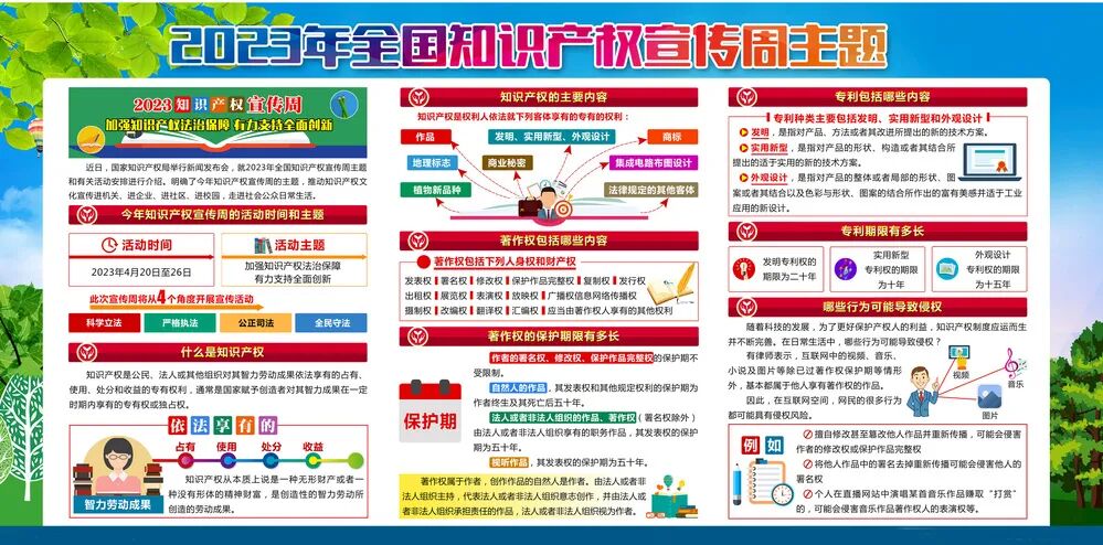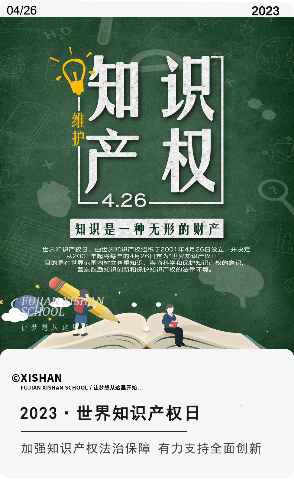 为加强知识产权相关法律法规知识宣传普及,提高学生保护知识产权意识,在第23个世界知识产权日到来之际,西山学校开展了以“我们与知识产权”为主题的知识产权宣传周活动。
