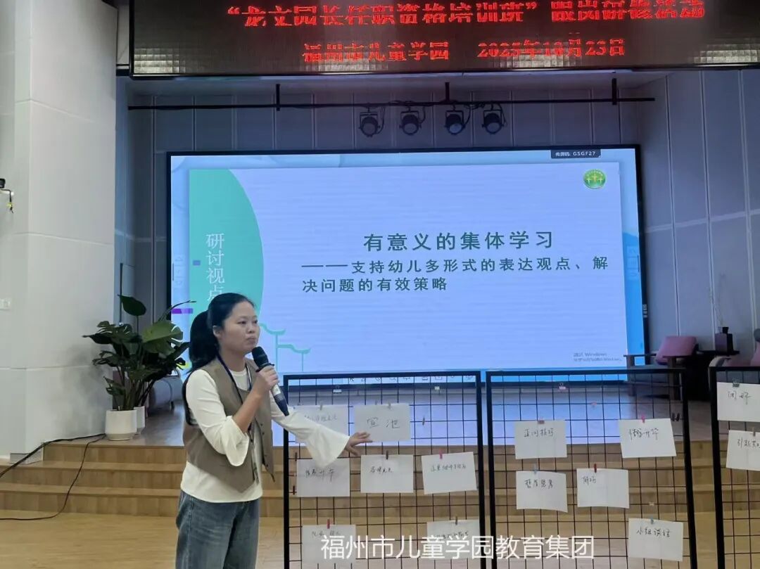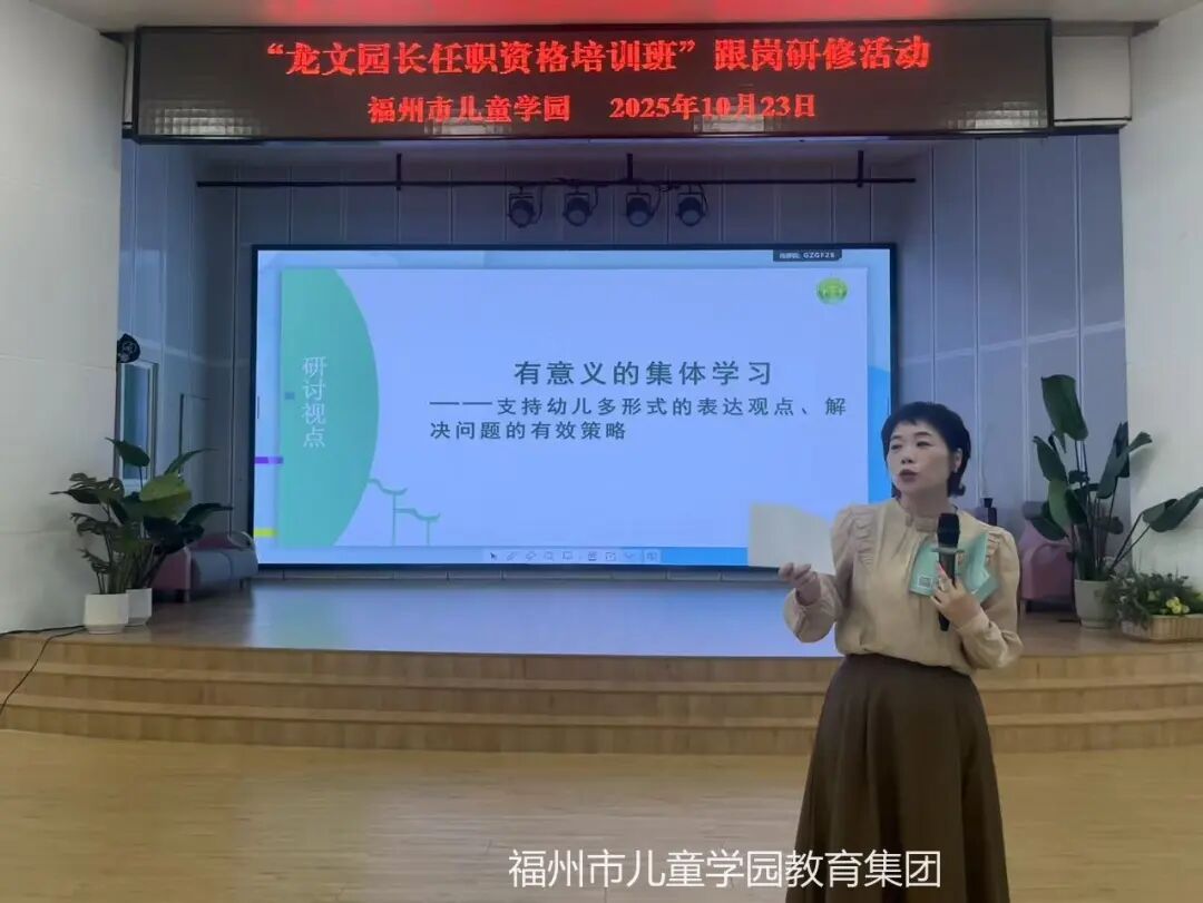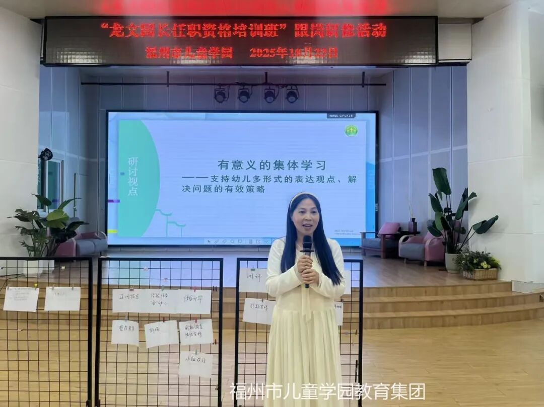 2025年10月23日,“漳州市龙文区园长任职资格培训班”的园长们走进福州市儿童学园教育集团白马校区跟岗研修。学园从校园文化建设、教育教学活动组织、园所课程建设等内容展开分享和交流,引领园长们提升专业素养与管理能力。