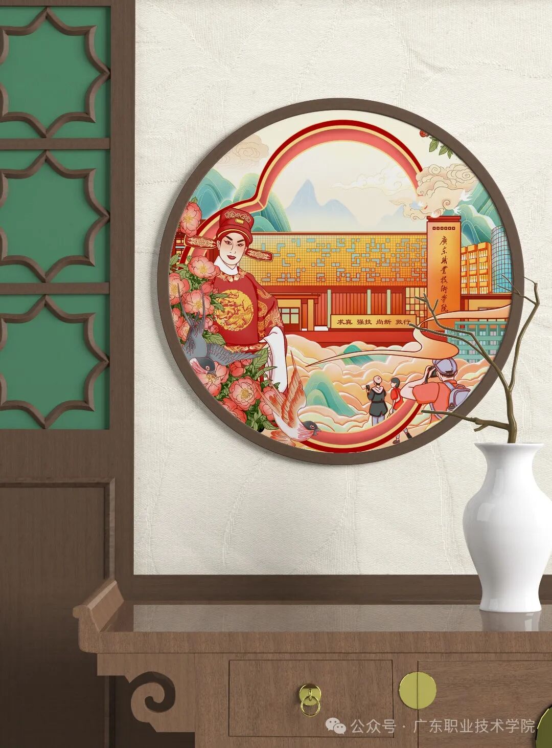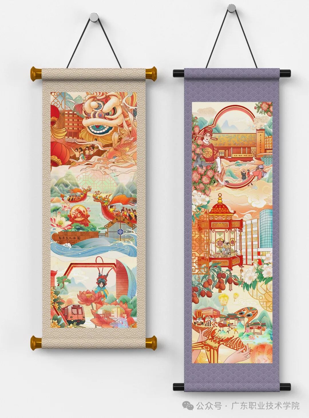 画卷之中,学校高明校区校门、图文信息大楼、禅城校区行政办公楼、南海校区教学楼居中而列,前有书海,后有崇岭,鲜花环簇,喜鹊报喜,状元祝福,欢迎、期待与寄望之情尽在其中。广职号整装欲发,三校区虚位以待,龙舟竞渡,醒狮采青,陶瓷璀璨,南风古灶之纹理,红油纸伞之雅致,渐次呈现。画卷特以四时飘香、纯洁真挚、温和高雅的芬芳白兰作点缀,白兰作为佛山市的市树和市花,在佛山有着悠久的种植历史,象征着佛山市民心中芳香四溢的城市记忆。一则画卷,满纸深情。