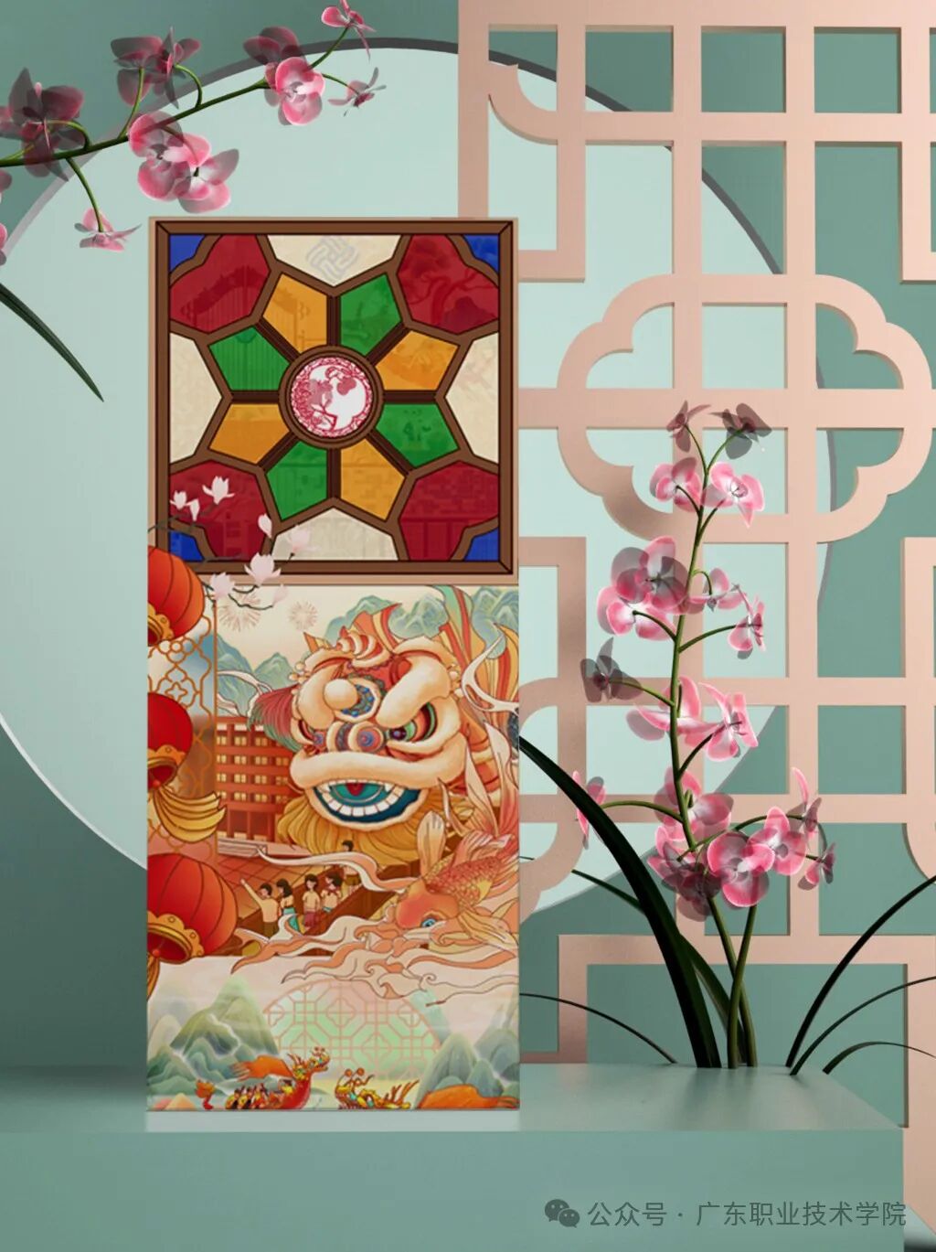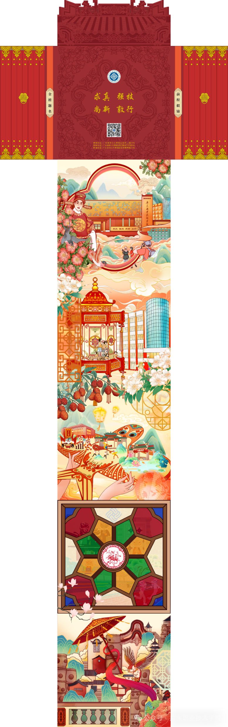 连结校长寄语页与录取通知书画卷之间,为取材于广州市博物馆馆藏广式彩色玻璃窗(亦称“满洲窗”),是清代以来广佛地区流行的用中式传统木窗棂镶嵌各色玻璃而成的建筑构件,《广州竹枝词》中“五色玻璃三面月,试从珠海听潮音”,生动描绘了这一窗式的工艺与意境。只见四角棂条曲线勾勒出“海棠”开光,内接几何式“莲花”开光为格心,嵌以红、绿、黄、蓝四色玻璃,细看这扇五彩斑斓的彩色玻璃中,广职的标志性建筑和网红打卡点若隐若现,中部花心处嵌套红蚀刻荔枝图玻璃画。荔枝为岭南风物,属“岭南佳果”之一,寓意广职学子学趣渐浓,硕果累累。正是“流光溢彩满洲窗,历久弥新岭南韵”。