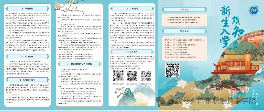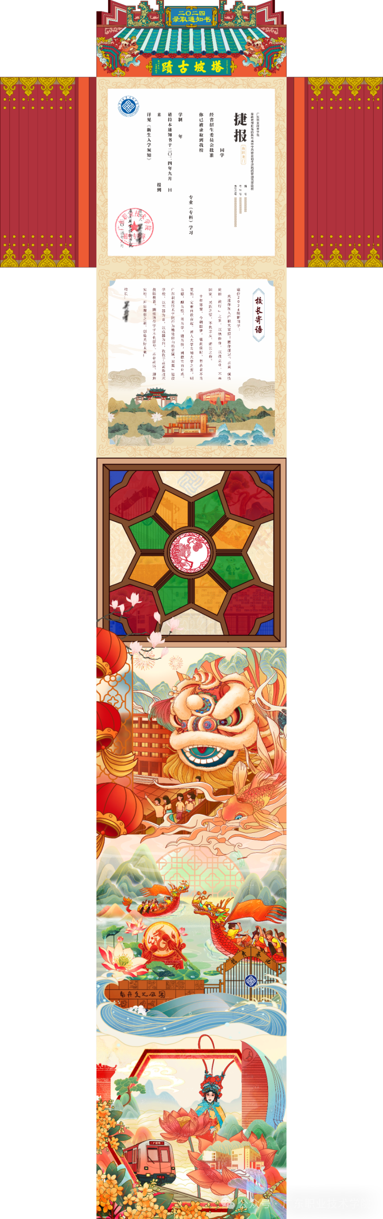 通知书封套,正面中上为金黄的录取通知书,右侧为校训,左上则是校徽与校名,右上为佛山初立之石牓,下为栩栩画卷,缓缓而展,2024年录取通知书居中,佛山非遗之艺、学校特色之景,揉于其中,相衬相托。岭南之乡,锣鼓响彻,醒狮跳跃,辰龙舞动,纸鸢翱翔,明灯徐升,喜庆之气跃然。