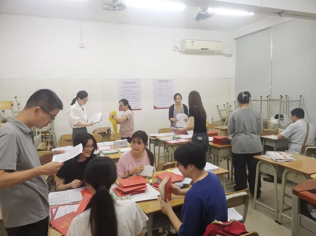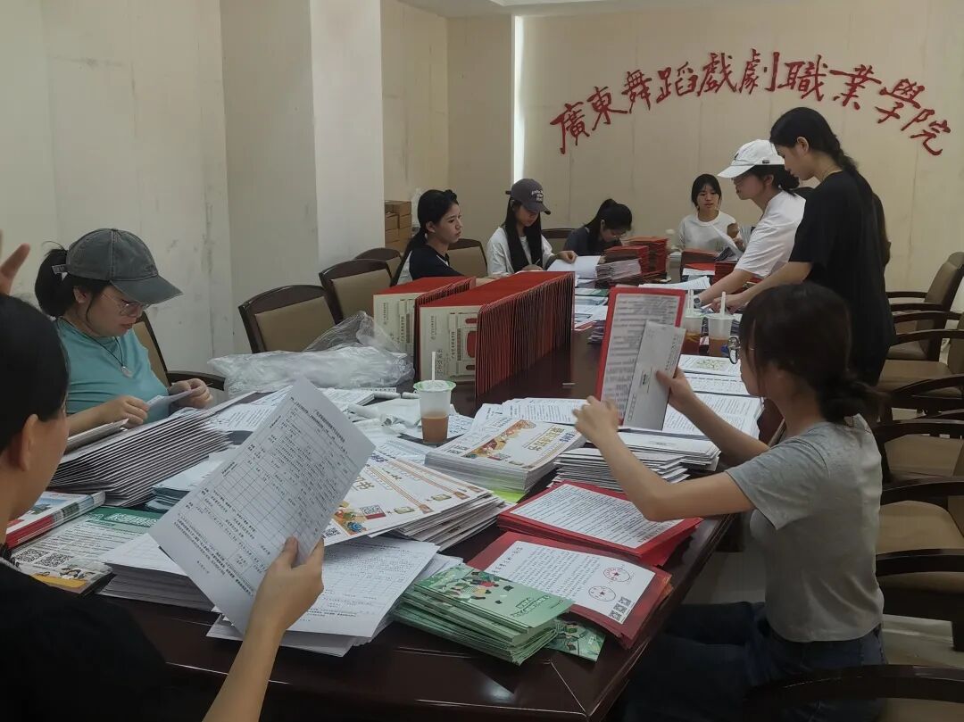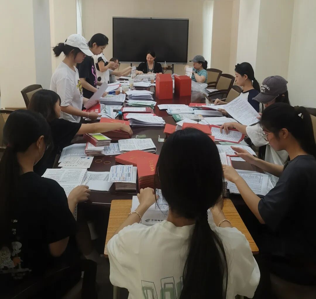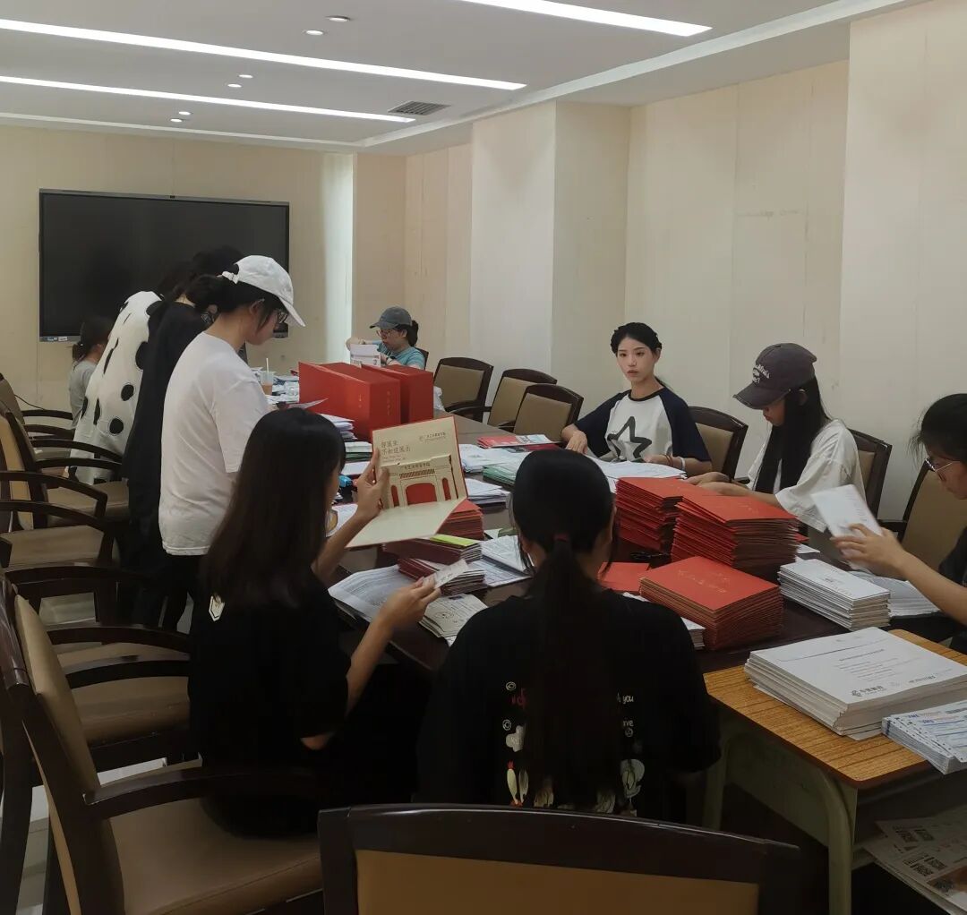 各学院师生们将每份录取通知书的材料挑拣、分装、细心打包好。