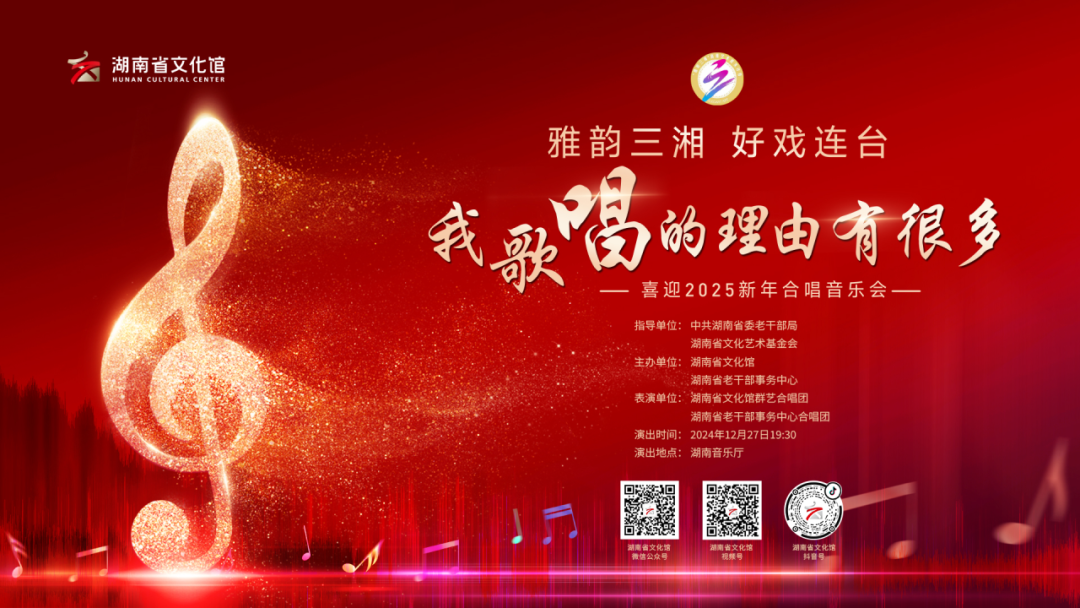 ♫. ♪ ~ ♬..♩~ ♫. ♪..♩~ ♫. ♪ ~ ♬..♩..♩~ ♫. ♪ ~ ♬..♩..♩~ ♫. ♪ ~ ♬..♩♫. ♪ ~ ♬..♩~ ♫. ♪..♩~ ♫. ♪ ~ ♬..♩..♩~ ♫. ♪ ~ ♬..♩..♩~ ♫. ♪ ~ ♬..♩♫. ♪ ~ ♬..♩~ ♫. ♪..♩~ ♫. ♪ ~ ♬..♩..♩~ ♫. ♪ ~ ♬..♩..♩~ ♫. ♪ ~ ♬..♩雅韵三湘·好戏连台《我歌唱的理由有很多》——喜迎2025新年合唱音乐会以“我歌唱的理由有很多”为主题,本次音乐会是由湖南省文化馆群艺合唱团、湖南省老干部事务中心合唱团精心策划与排练,为迎接新年献上的音乐盛宴。近80位热爱合唱艺术、训练有素的退休老干部和老同志,带着对高雅艺术的追求和对美好生活的向往,将通过丰富多彩的艺术形式,深情演绎十余首中外艺术歌曲,用歌声传递对2025年新年的美好祝愿。