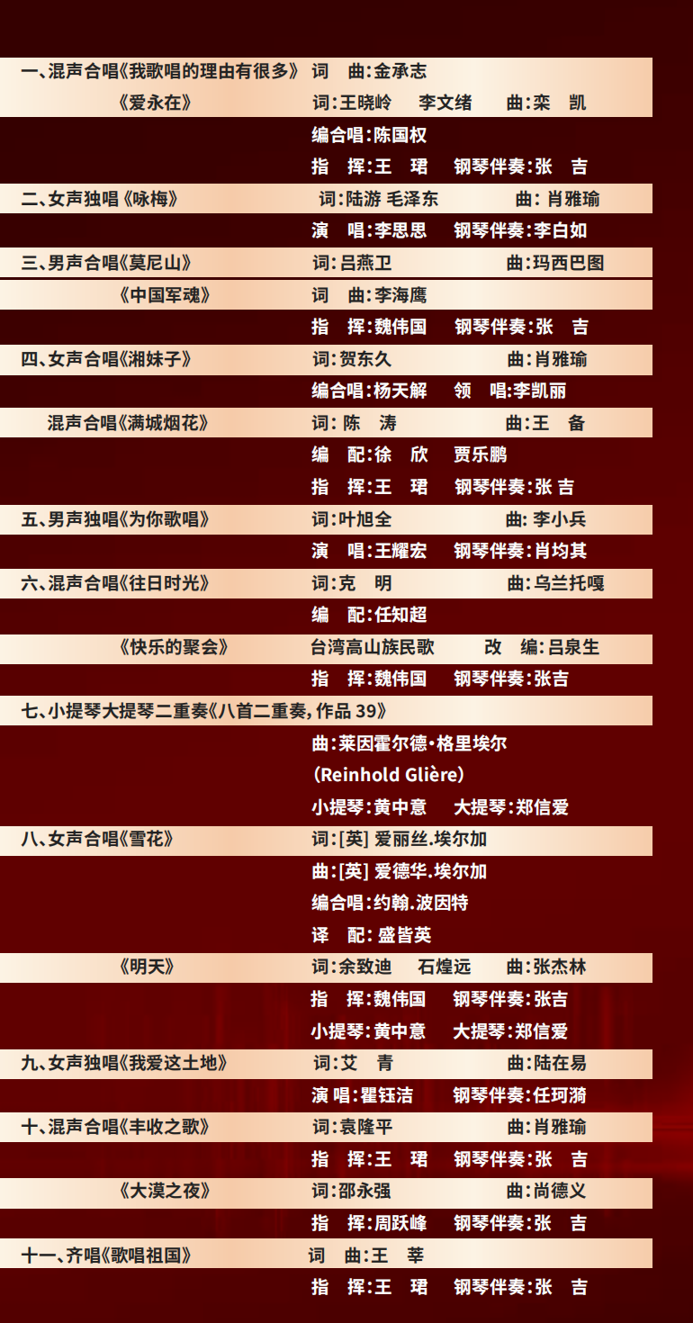 音乐会的曲目选择丰富多彩,包括了深受观众喜爱的经典合唱作品《我爱这土地》和《雪花》,这些作品以其深情的旋律和独特的艺术风格著称。通过一系列风格多样、形式丰富的合唱作品,音乐会将生动展现湖南地区群众合唱艺术的活力与热情,让观众在美妙的旋律中感受到音乐的魅力和群众文化的深厚基础。
