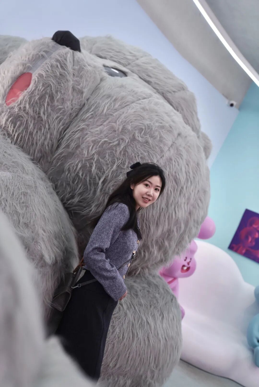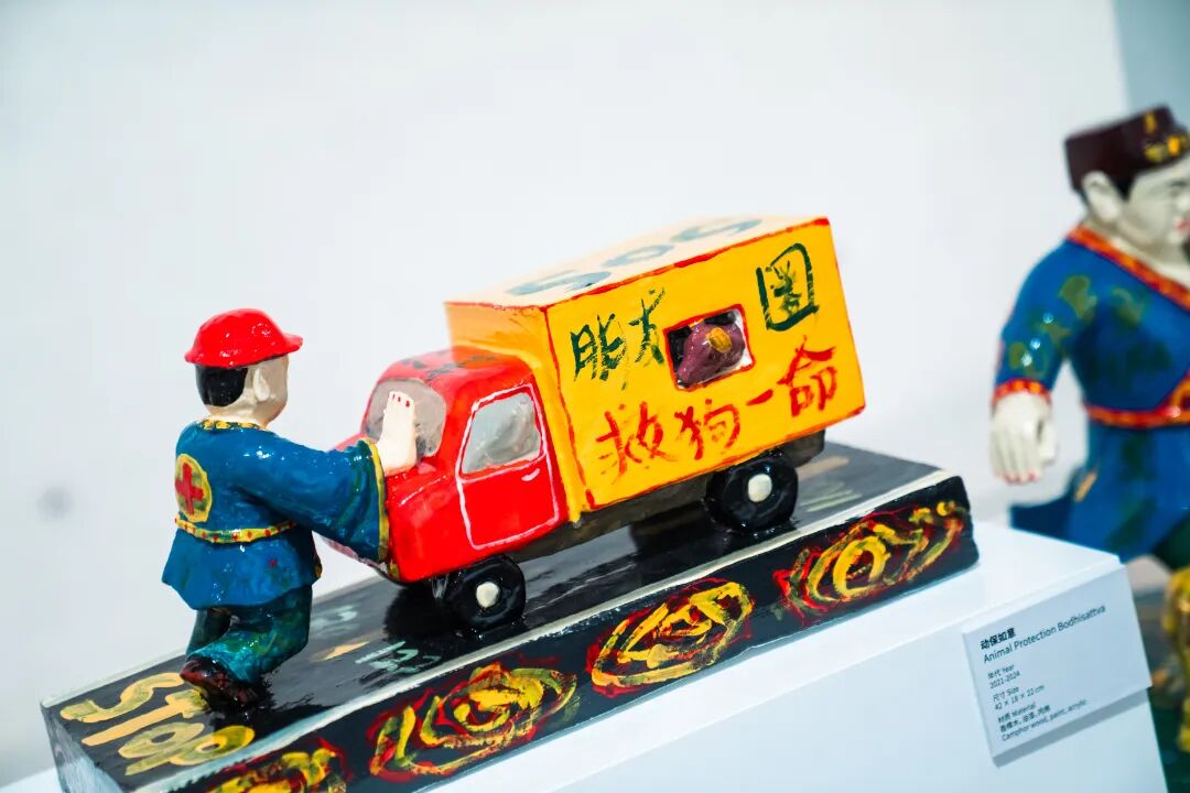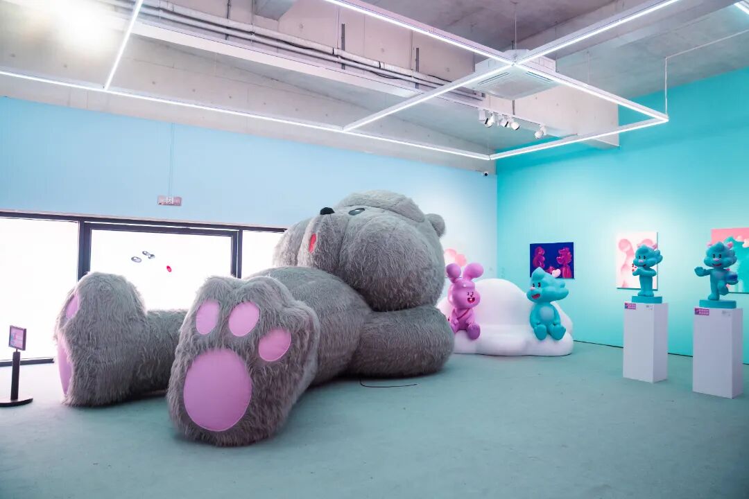 “日常”中的二次元与现实在展览中相遇。无论是钝感十足的粉色兔兔、会修飞船的白色熊熊,或是会心灵感应的绿色龙龙,都在讲述着一种温柔且有力量的情感语汇。