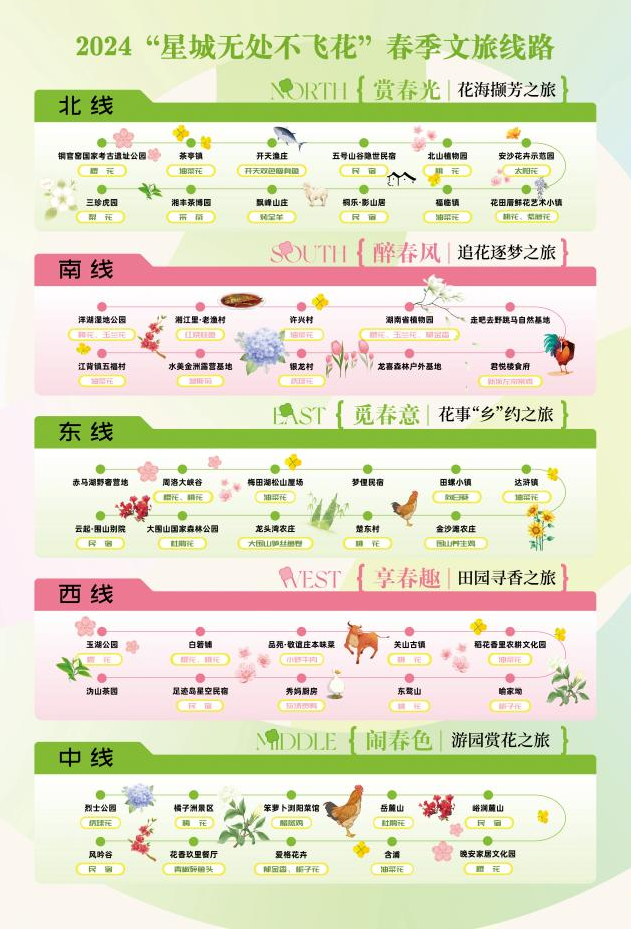 洋湖湿地公园(梅花、玉兰花)——湘江里·老渔村(红烧桂鱼)——许兴村(油菜花)——湖南省植物园(樱花、玉兰花、郁金香)——走吧去野跳马自然基地——君悦楼食府(新派左宗棠鸡)——龙喜森林户外基地——银龙村(绣球花)——水美金洲露营基地(波斯菊)——江背镇五福村(油菜花)