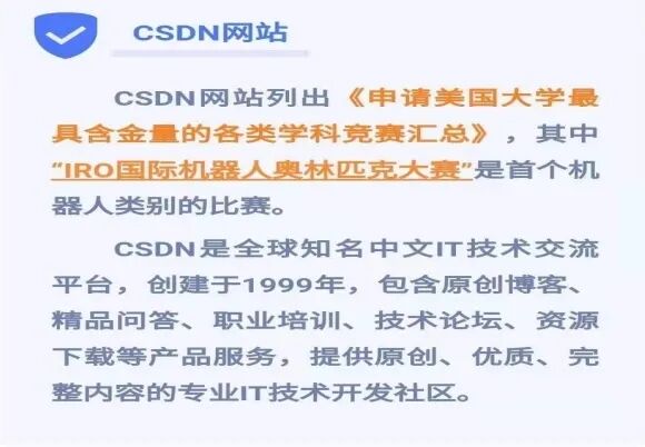 IRO是由世界著名理工类大学教授组建的委员会,孩子在 IRO国际赛中获得奖项,很容易被国外优秀的理工类高校录取。IRO国内指导高校为:“清华大学”和“中国科学院大学”。出美留学网站上显示,IRO是继国际信息学大赛(IOI),含金量排名第二的国际赛事。