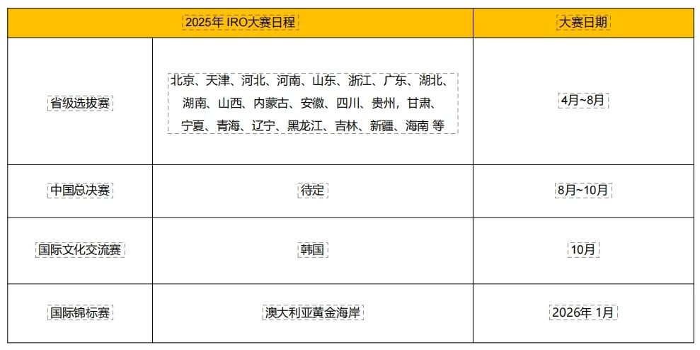 IRO创办于1999年,由联合国教科文组织(UNESCO)指导,已成功举办26届,覆盖全球30+成员国,累计参赛人数超10万!2025年第二十七届国际锦标赛将在澳大利亚黄金海岸举办,与50+国家选手同台竞技!