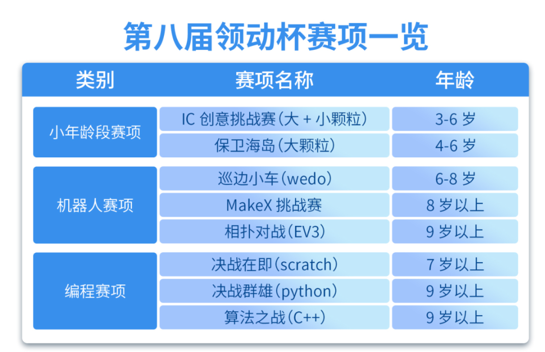 共设硬件机器人和软件编程两大类赛事共8个赛项,其中,硬件机器人包括:IC创新挑战(大+小颗粒)、Ev3(相扑)、MakeX(挑战赛)、Wedo2.0(巡边小车)、保卫城堡(大颗粒);软件编程包括:Scratch、C++、Python,需实操上机。
