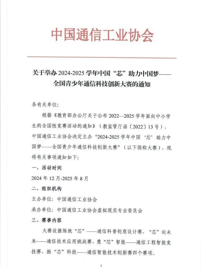 为贯彻落实《全民科学素质行动规划纲要(2021-2035年)的通知》中提出的青少年科学素质提升行动,攻坚通信领域关键核心技术“卡脖子”难题,培育一大批具备科学家潜质的青少年群体,在青少年中普及通信创新知识、树立科学报国的理想信念。根据《教育部办公厅关于公布2022—2025学年面向中小学生的全国性竞赛活动的通知》(教监管厅函〔2022〕13号),中国通信工业协会将举办“中国‘芯’助力中国梦——全国青少年通信科技创新大赛”。