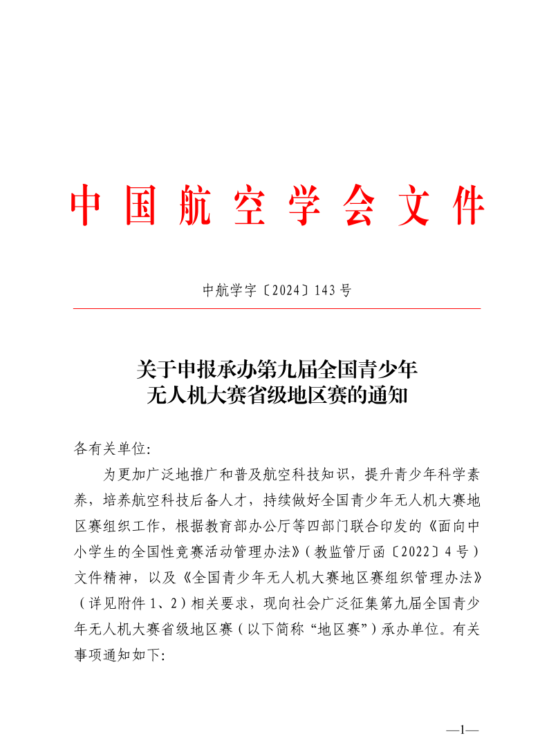 为深入贯彻中共中央办公厅、国务院办公厅印发的《关于新时代进一步加强科学技术普及工作的意见》,全面落实教育部等十八部门《关于加强新时代中小学科学教育工作的意见》,在教育“双减”中持续做好科学教育加法,中国航空学会着眼于人工智能时代背景下航空创新后备人才培养,从2017年开始举办“全国青少年无人机大赛”, 并于2020年起,连续入选教育部公布的面向中小学生全国性竞赛活动名单(教监管厅函〔2022〕13 号),成为我国青少年科学素质教育领域最具权威性、专业性、影响力的无人机赛事活动。