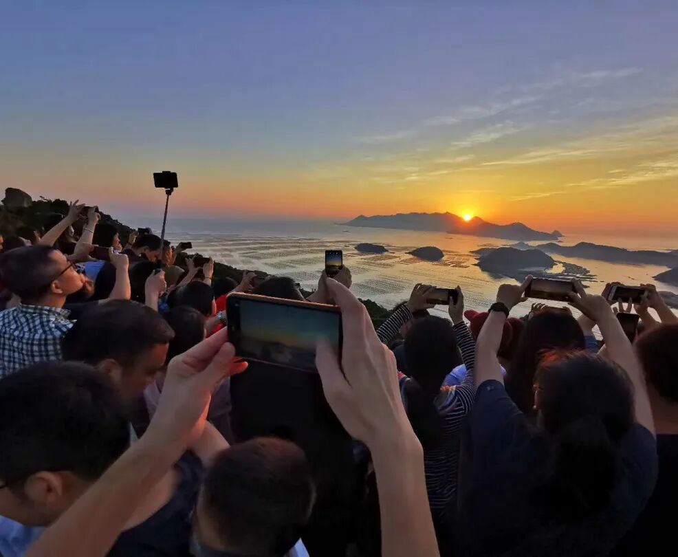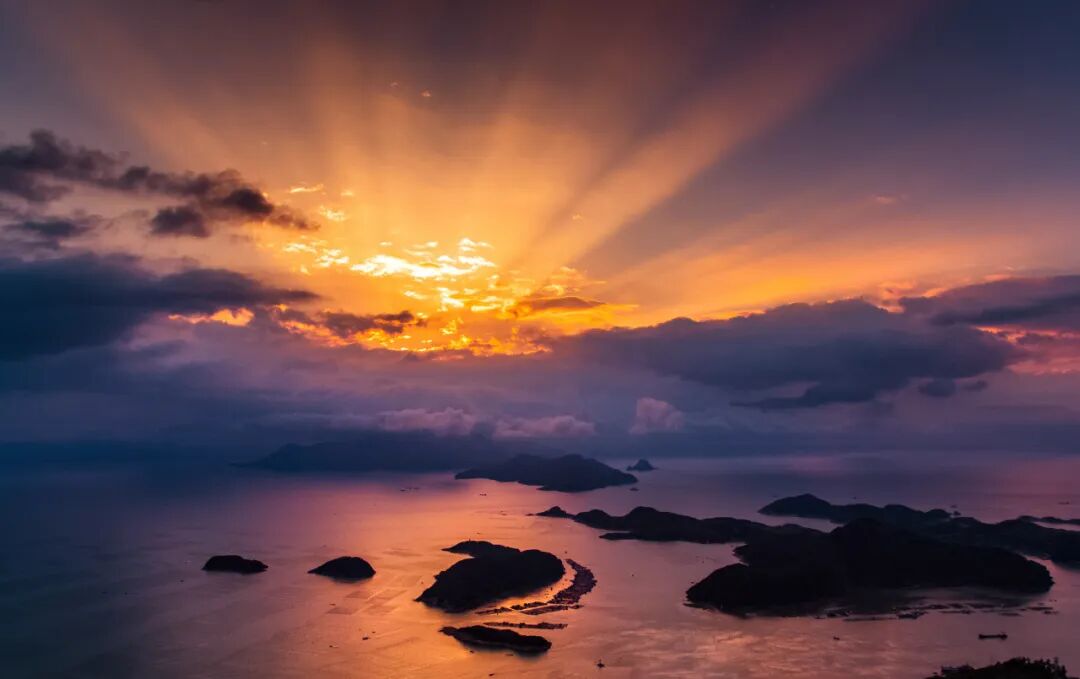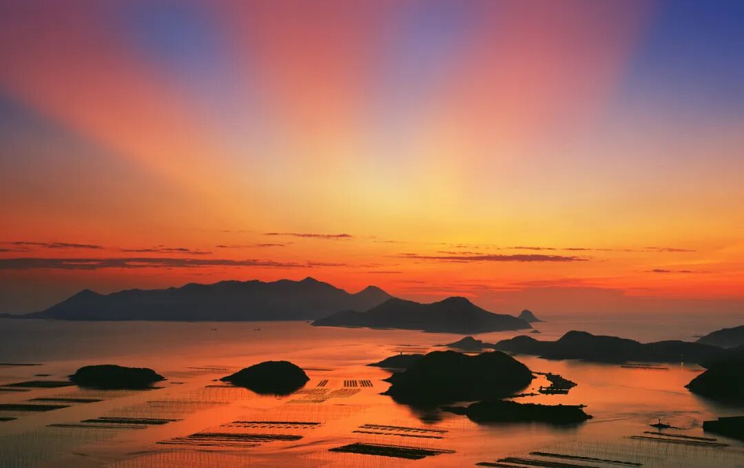当一轮红日从海面冉冉升起,光影变幻,道道霞光倾泻而出,整个海面瞬间被染成青色、蓝色、紫色、黄色、红色、金色……
