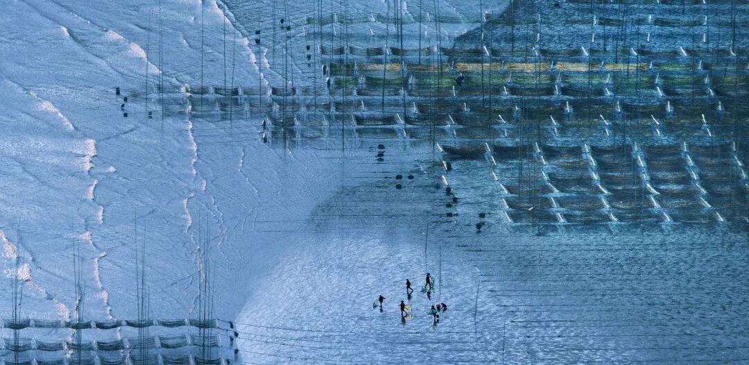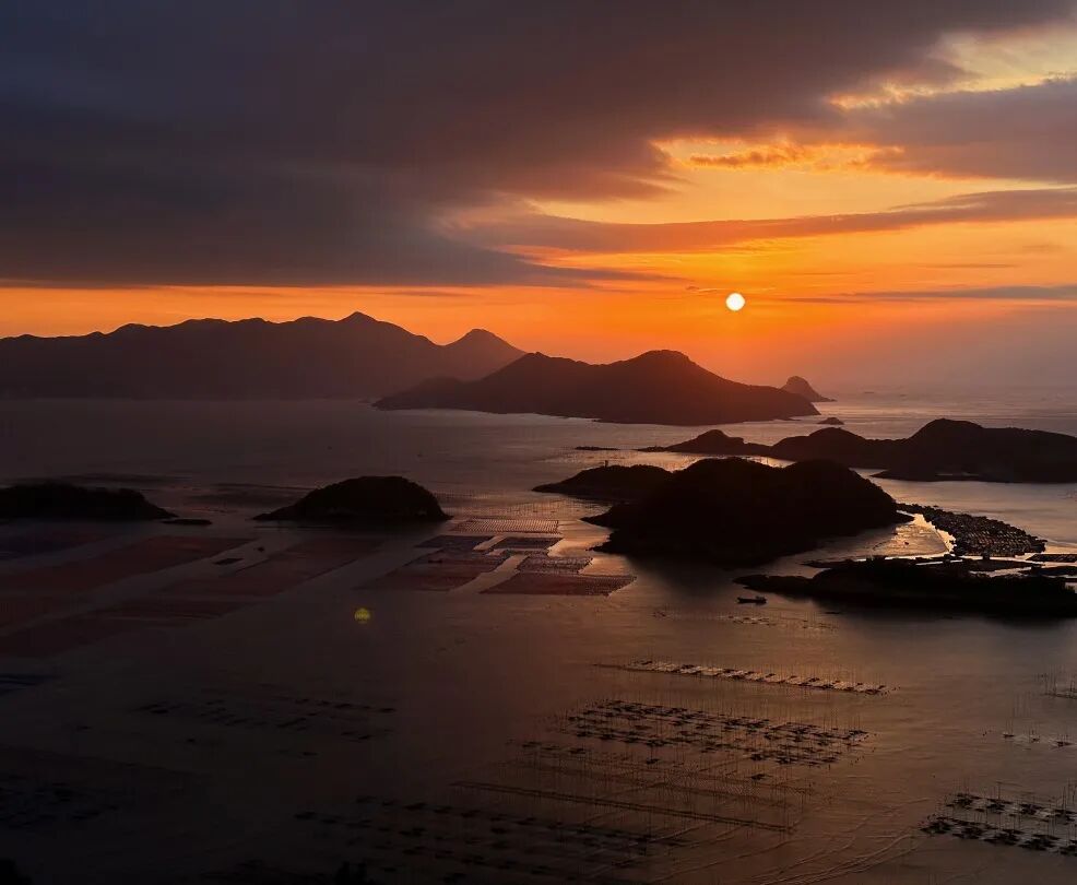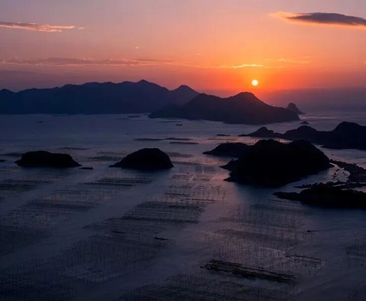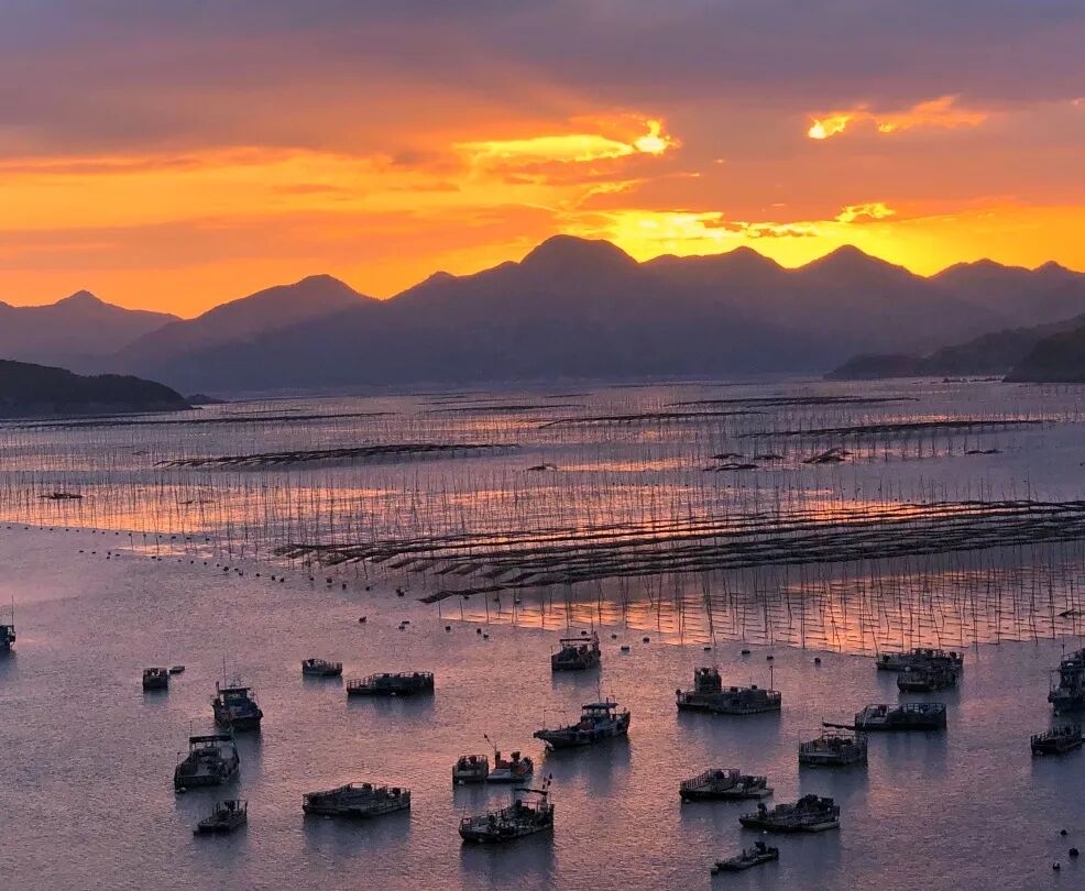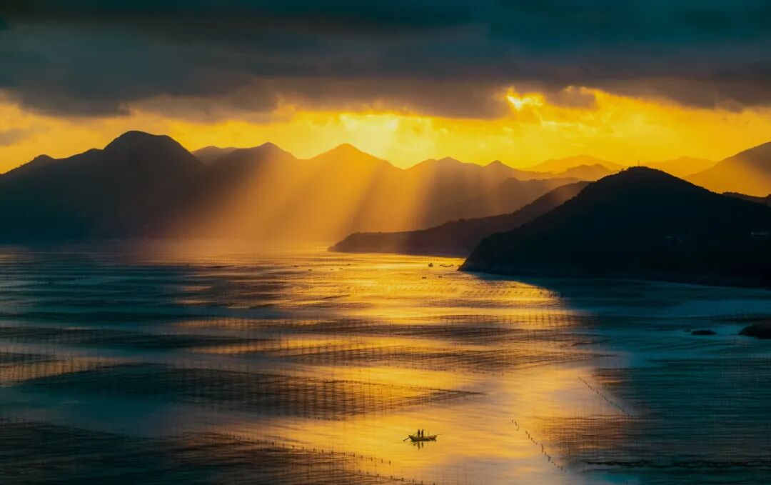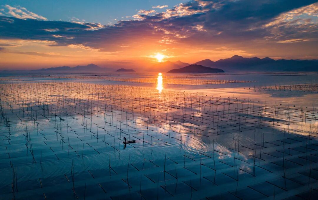 夕阳之下,阳光撒向人间铺满滩涂,一半是海的幽蓝,一半是落日的金光闪闪。渔船点点,帆影婆娑,划过海面,宛如一幅流动的金色画卷。