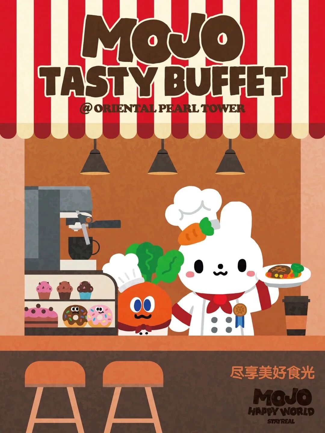 更重磅的是STAYREAL携手用满载快乐DNA的MOJO FAMILY,与东方明珠全新打造全球第一间「MOJO HAPPY WORLD之主题限定餐厅」。这一空间则以“从视觉到味觉的快乐延伸”为核心,打造可食、可玩、可体验、可互动的多维体验空间。MOJO FAMILY成员化身餐厅主厨,各自分工,穿越奇趣世界、寻遍环球美食,希望征服每个食客的味蕾,让每一口食物都成为心灵的慰藉。与此同时,成员们以趣味形式贯穿全场,多款精心彩蛋与创意美食为现场增添无限惊喜,让快乐在现实空间中被感知和共享。