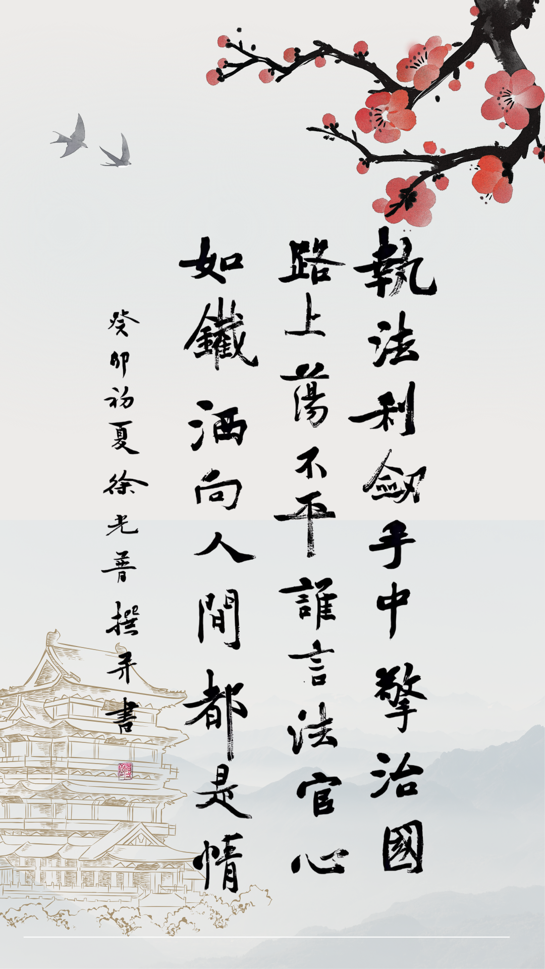 释文:执法利剑手中擎,治国路上荡不平;谁言法官心如铁,洒向人间都是情。