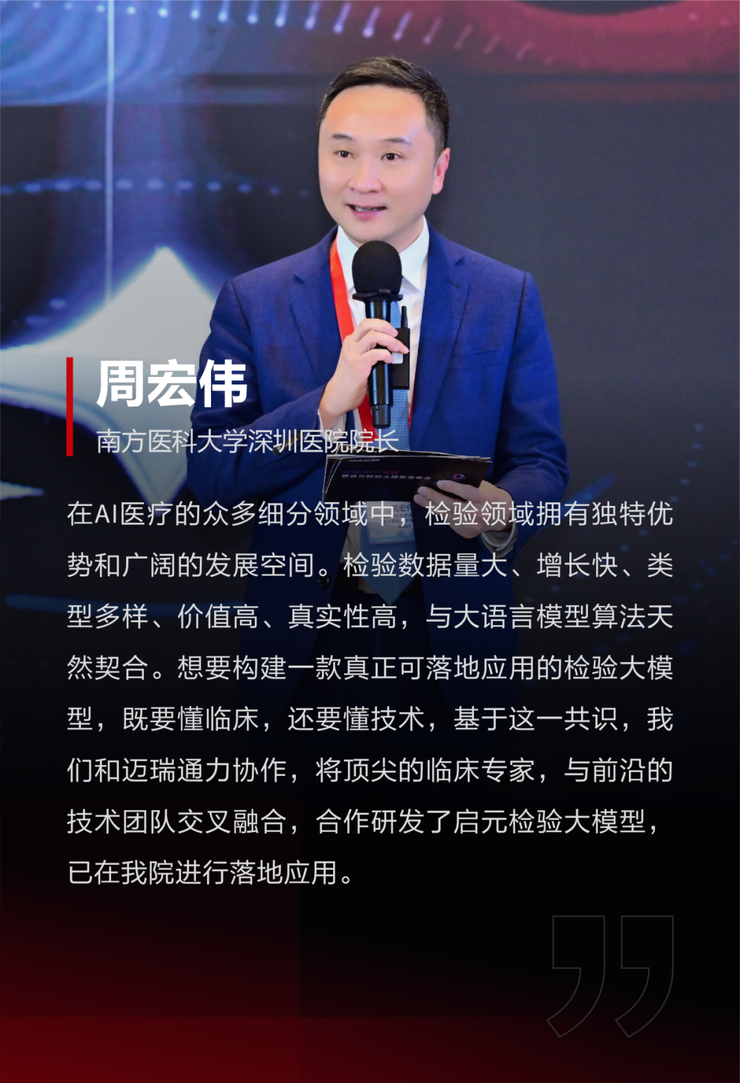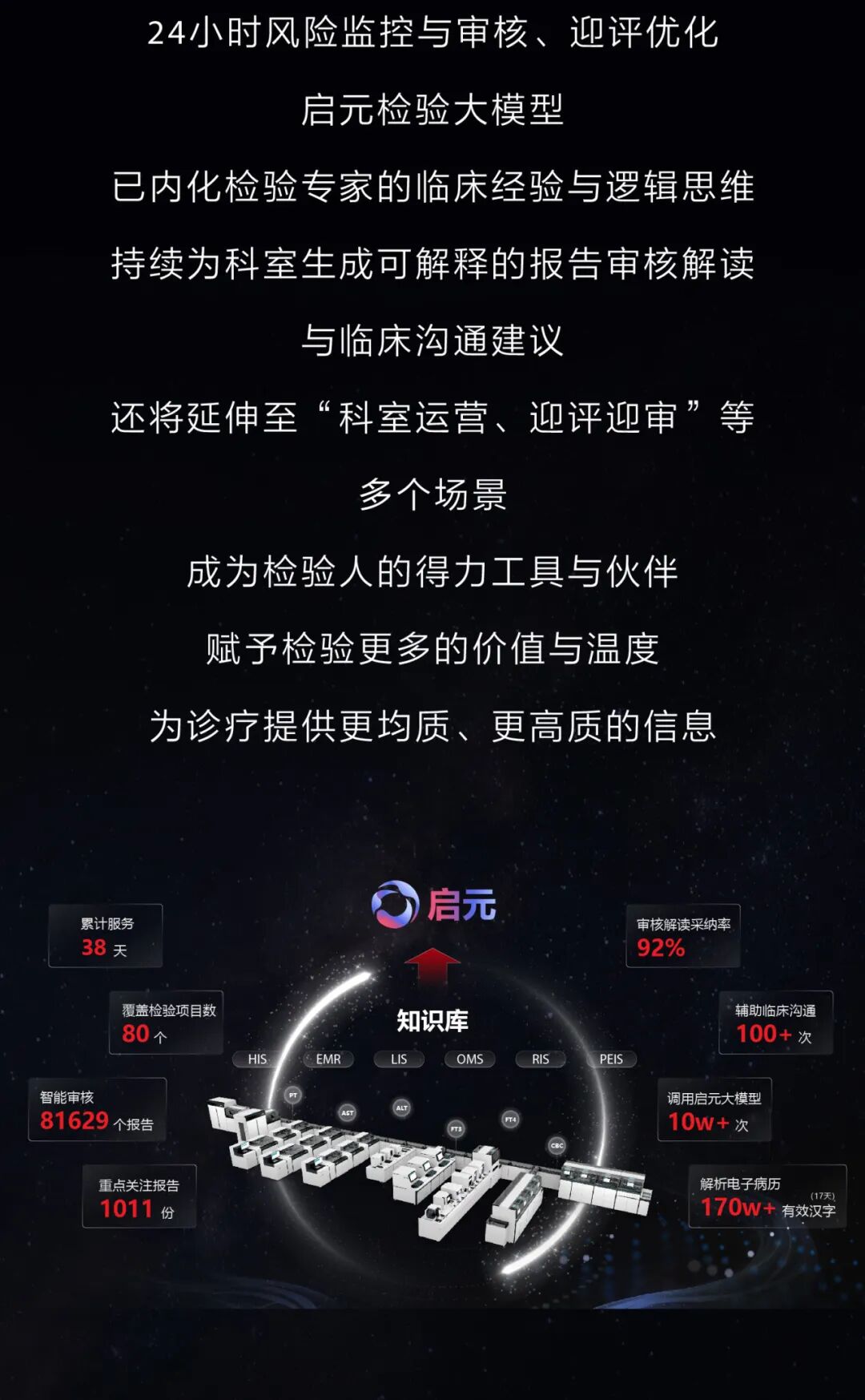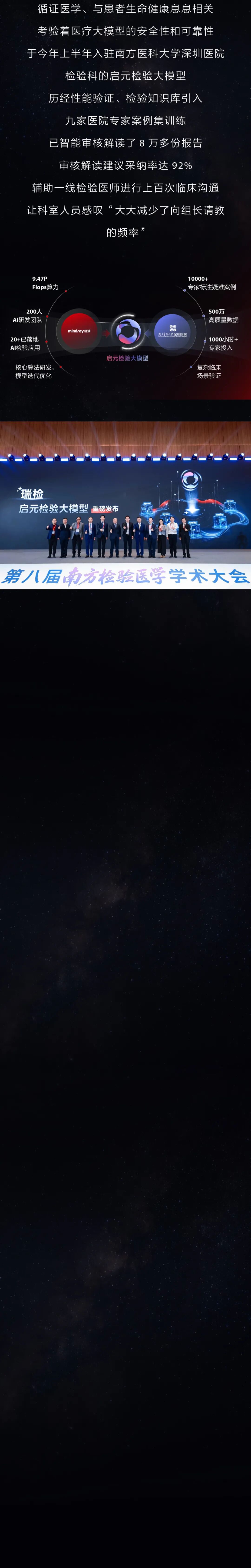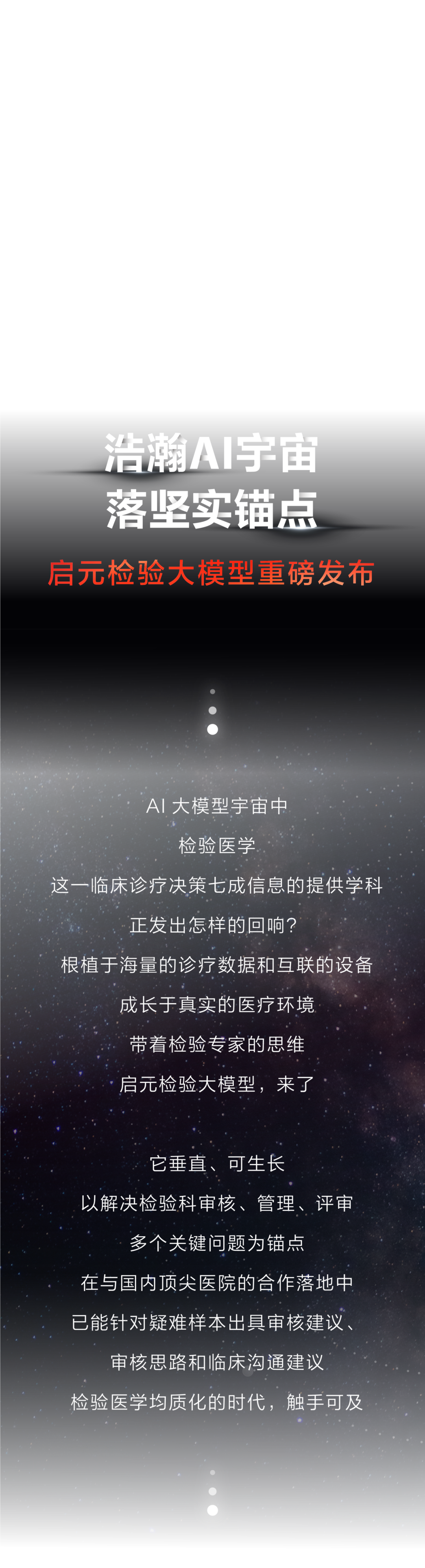 浩瀚AI宇宙 落真实锚点 启元检验大模型重磅发布 AI大模型宇宙中 检验医学 这一临床诊疗决策七成信息的提供学科 正发出怎样的回响? 根植于海量的诊疗数据和互联的设备 成长于真实的医疗环境 带着检验专家的思维 启元检验大模型,来了 它垂直、可生长 以解决检验科审核、管理、评审 多个关键问题为锚点 在与国内顶尖医院的合作落地中 已能针对疑难样本出具审核建议、 审核思路和临床沟通建议 检验医学均质化的时代,触手可及 垂类新生 诞生于医工智紧密协作 循证医学、与患者生命健康息息相关 考验着医疗大模型的安全性和可靠性 于今年上半年入驻南方医科大学深圳医院检验科的启元检验大模型 历经性能验证-检验知识库引入 -九家医院专家案例集训练 已智能审核解读了8万多份报告 审核解读建议采纳率达92% 辅助一线检验医师进行上百次临床沟通 让科室人员感叹“大大减少了向组长请教的频率” AI伙伴 像检验专家一样思考 24小时风险监控与审核、迎评优化 启元检验大模型 已内化检验专家的临床经验与逻辑思维 持续为科室生成可解释的报告审核解读与临床沟通建议 还将延伸至“科室运营、迎评迎审”等多个场景 成为检验人的得力助手与伙伴 赋予检验更多的价值与温度 为诊疗提供更均质、更高质的信息 洞见再叙 共抵检验+AI的未来 产、学、研共建 检验大模型无限可能 未来,启元检验大模型将孜孜不倦搭建 检验与临床沟通的桥梁 打通更多样的数据与学科大模型 涵盖质量管理、精准医疗、慢病管理等 多个关乎民生健康的关键场景 期待与更多专家并肩前行,成为智慧医疗时代开创者! 在浩瀚的AI宇宙 我们追逐着璀璨的新星 但真正的价值 在于在纷繁的智能幻象中 找到那个坚实的价值锚点 它源于人类的智慧、协作与真实环境的滋养 我们坚信 技术理性与价值理性能共生 未来启元检验大模型还将在医疗界 共同的努力下 向新,向上,向深
