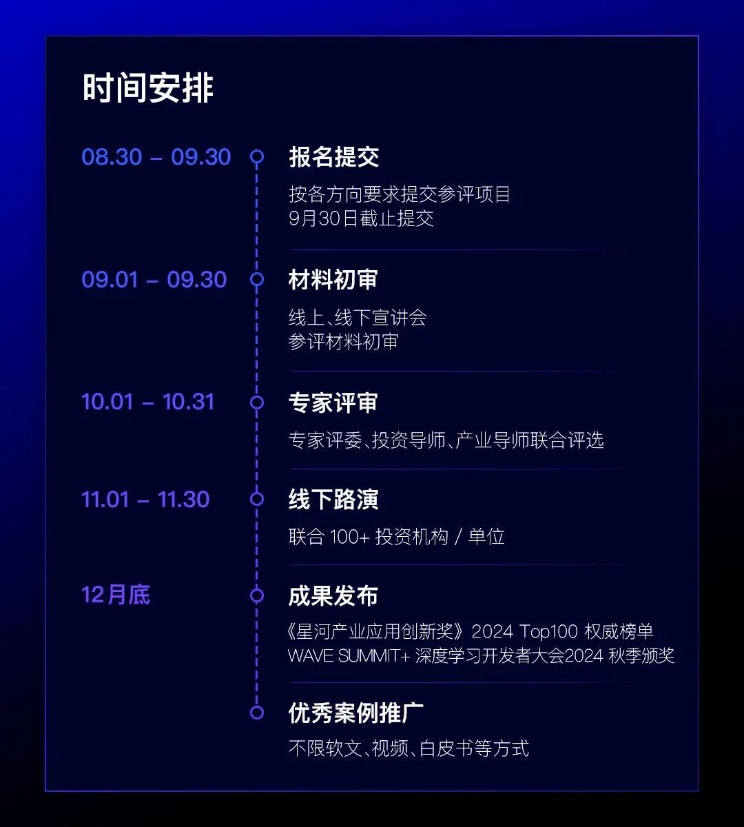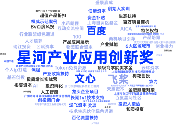 2024年,“星河产业应用创新奖” 全新起航。第五届“星河产业应用创新奖”依托文心大模型和飞桨最新技术和产品,联合区域政府单位、头部组织和企业、行业联盟、百家投资机构,遴选100个具备创新力、技术力、价值度的优质产业应用及创新方案,入选项目将在 WAVE SUMMIT+ 深度学习开发者大会2024现场公布,并进入《星河产业应用创新奖》2024Top100权威榜单。