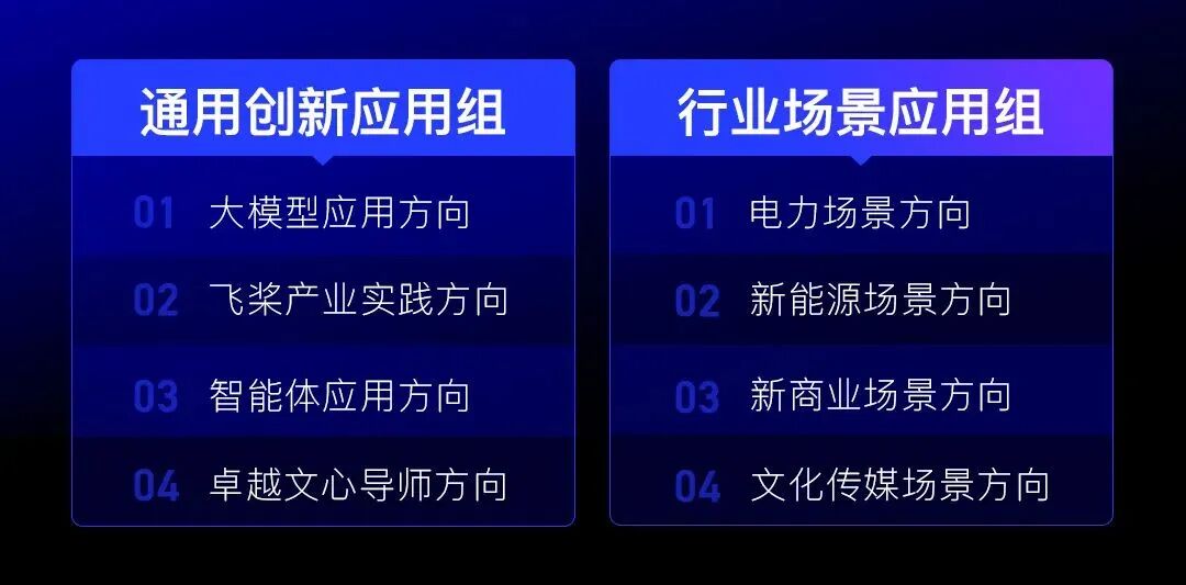 通用创新应用组:依托飞桨和文心大模型最新技术和产品,推动企业实际业务与 AI 深度融合,设置大模型应用、飞桨产业实践、智能体应用和卓越文心导师四大方向,征集优质的产业应用方案。