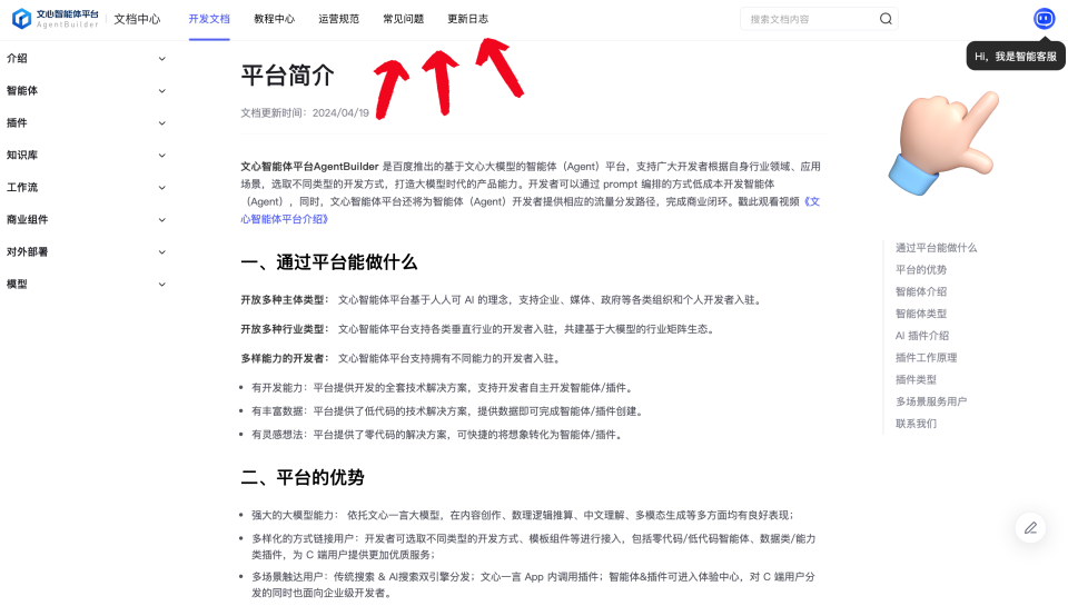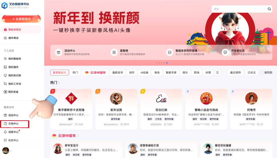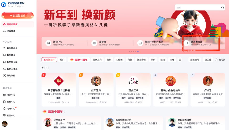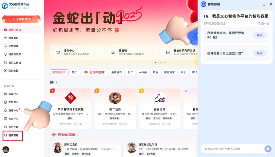 您可以通过文心智能体平台首页左侧【服务空间】-【文档中心】进行问题自查,也可点击【文档中心】智能客服的弹窗或者下滑到【服务空间】底部使用【智能客服】进行咨询;此外,平台的【社区中心】可供开发者们进行交流和学习(点击文末「阅读全文」可跳转至官网)。