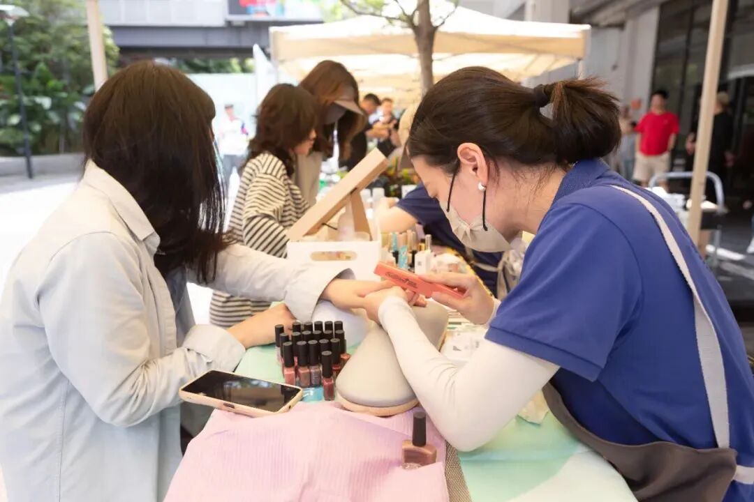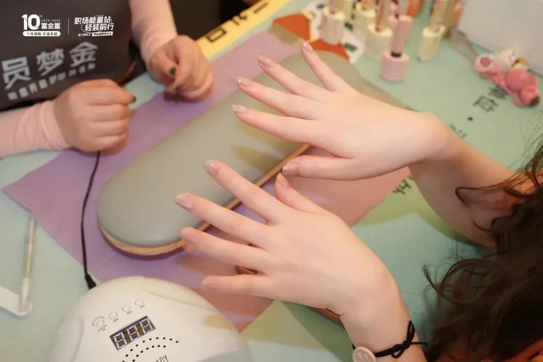 另一边,员梦金美甲设计组特意为每一位到场员工打造指尖艺术。美甲师们精心挑选、认真打磨,提供各种颜色指甲油供员工选择,再根据女孩们的喜好和手型,为她们设计出多彩美甲款式。
