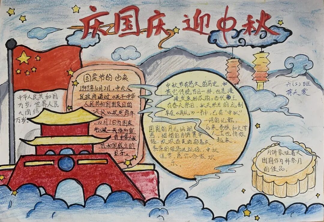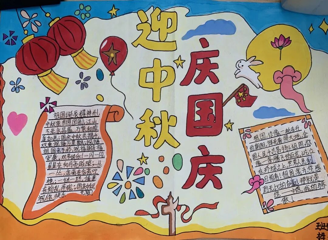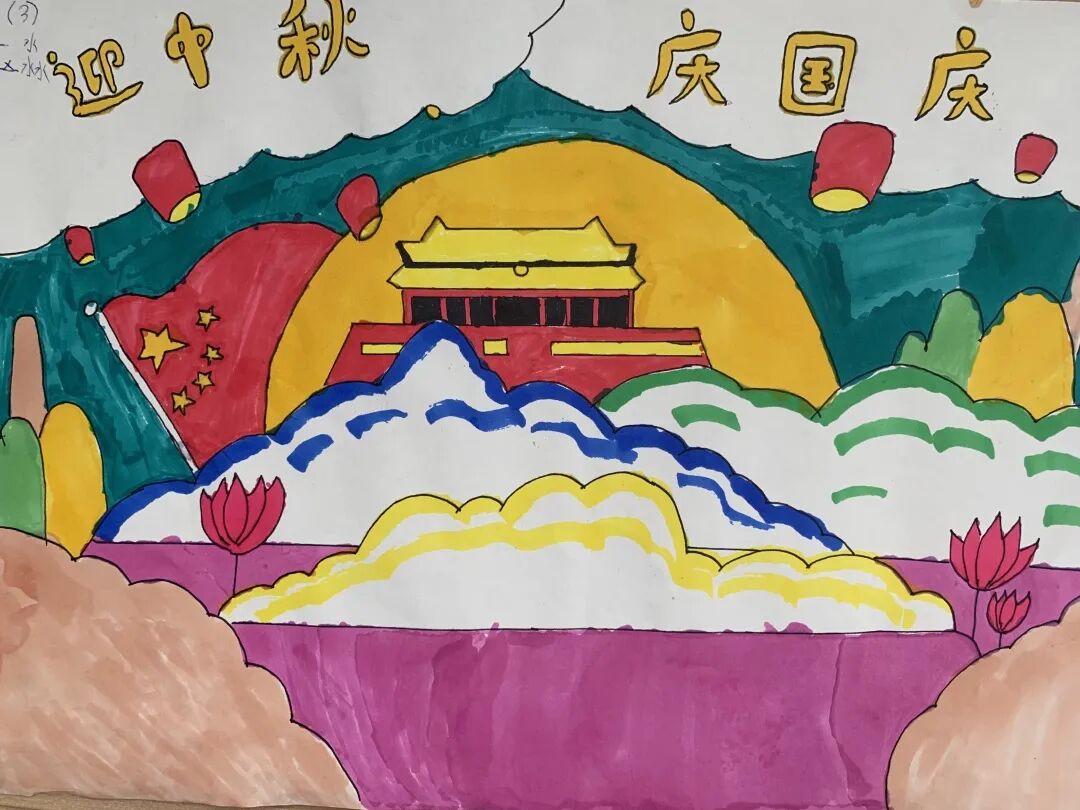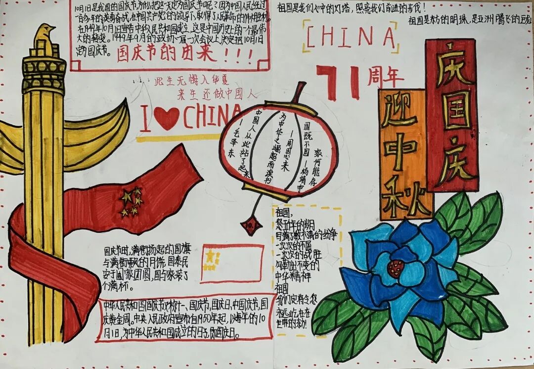一年级的孩子们用一幅幅画和手工作品表达对祖国妈妈的热爱;六年级的学生用书法和手抄报来表达对祖国的热爱之情。