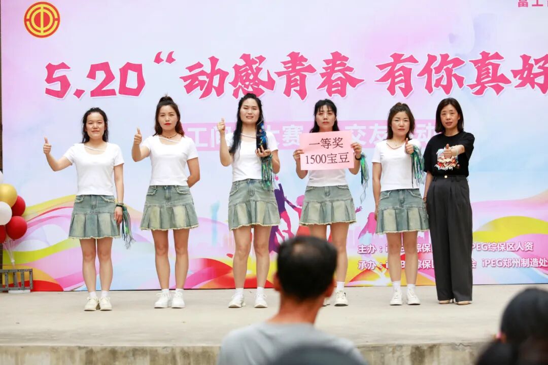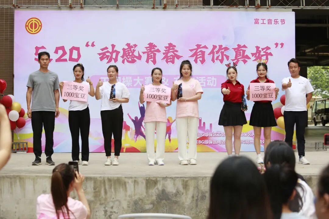 为培养员工健康意识增强员工体质,营造“快乐工作 健康生活”的文化氛围,5月20日,由iPEBG综保区工会主办,iPEBG综保区周边工会、iPEG综保区人资承办的“动感青春”工间操大赛在E15星光广场隆重举行。iPEBG综保区周边工会梅婉芳主席、iPEBG综保区工会刘怀勇主管、iPEBG综保区工会女工委闫贞主管、iPEG郑州制造处金加一厂娄渊伟课长、iPEG郑州制造处金加二厂原满星课长、人才发展总处高阶人才服务中心席保军医师、iPEG郑州制造处表面一厂张雯雯等主管出席本次活动并担任评委。