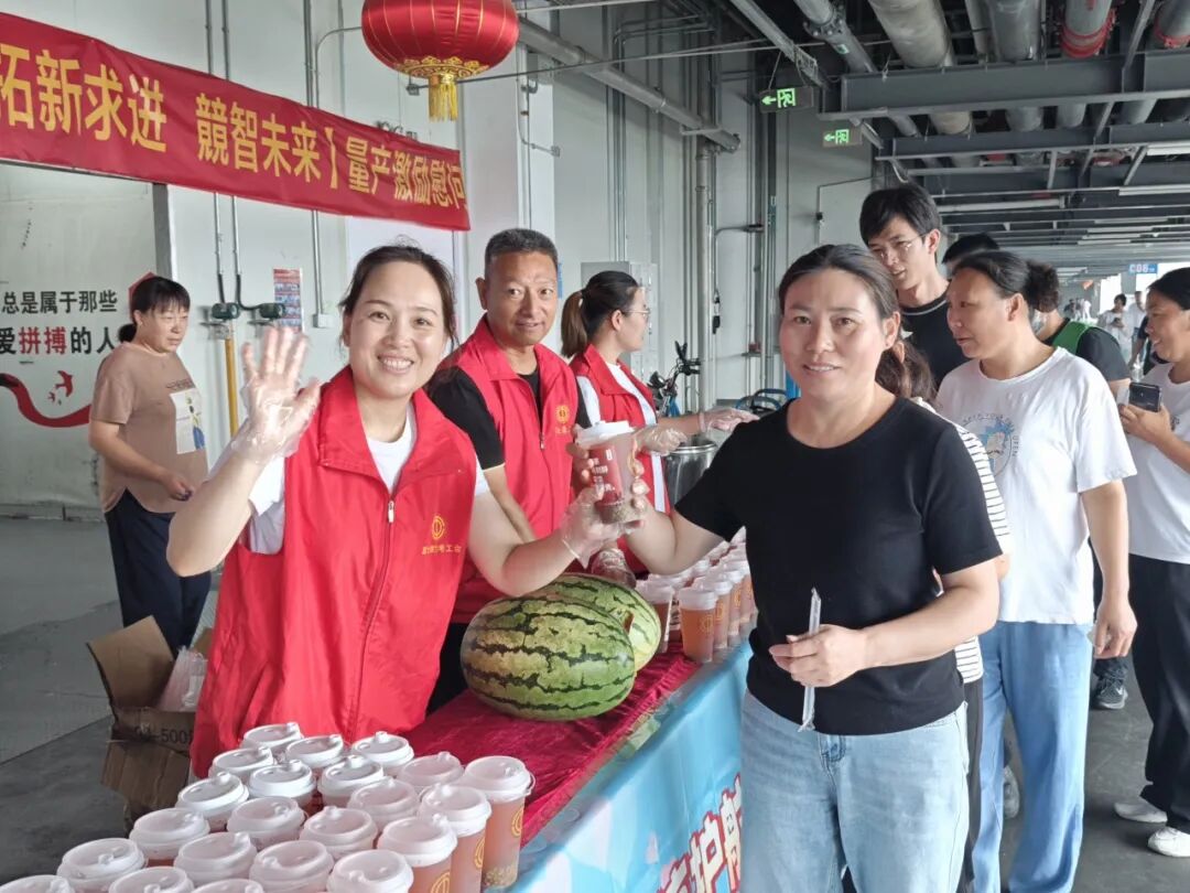 工会工作人员深入车间门口、连廊、户外工作岗等区域,将矿泉水、清凉毛巾等防暑物资送到一线员工手中,并在G05栋设立集中发放点,为员工精心准备绿豆水、并配发防暑物资。员工们纷纷表示:"娘家人准备的绿豆水和西瓜超级贴心,让我们干活更有劲!"